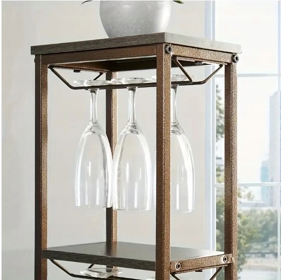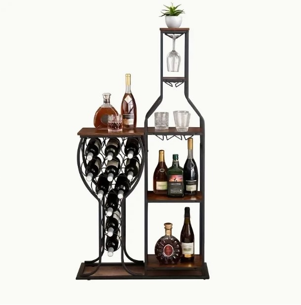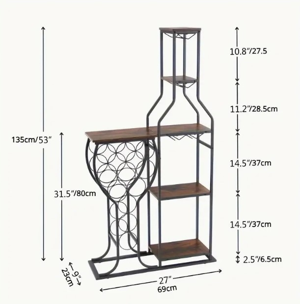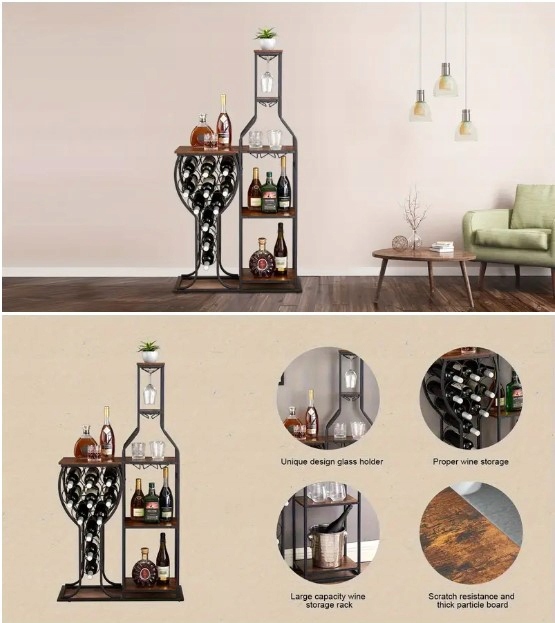 5-poziomowy regał na wino wykonany z metalu i grubej płyty wiórowej, odporny na zarysowania.