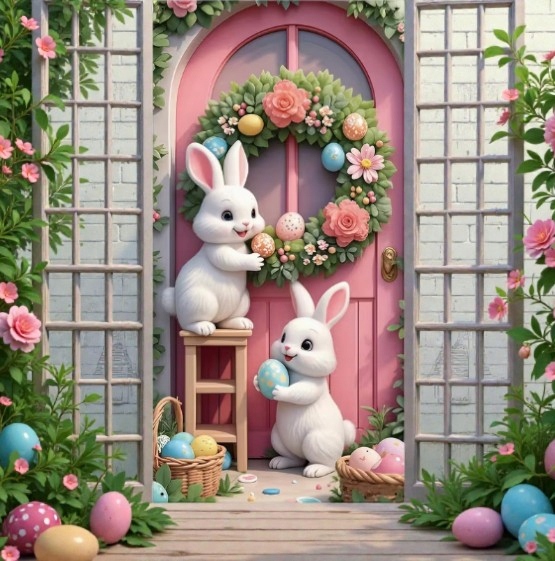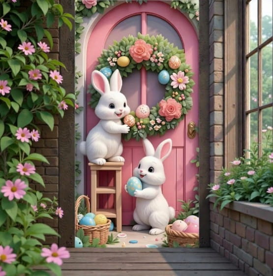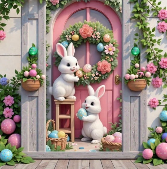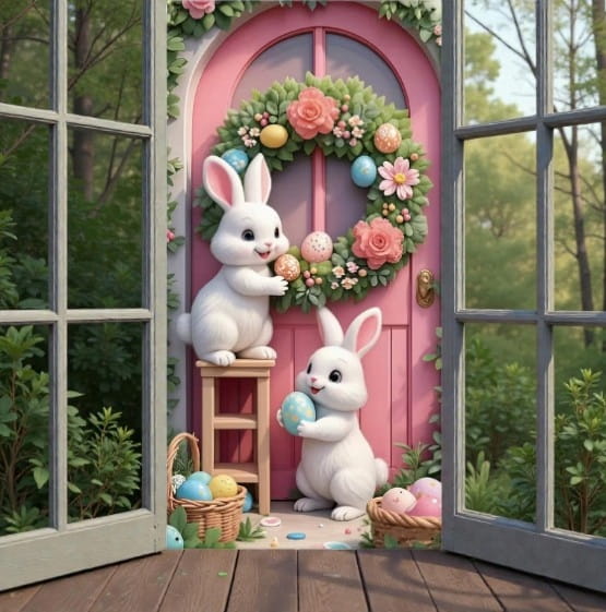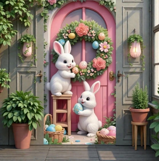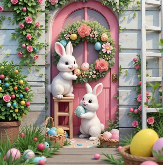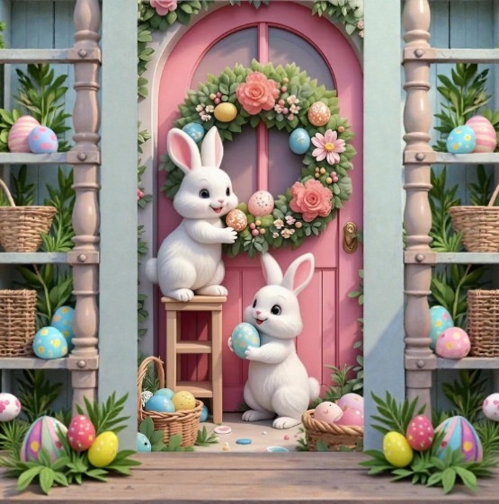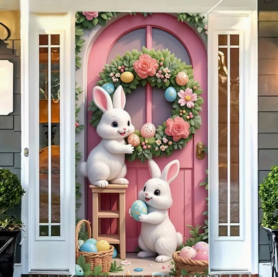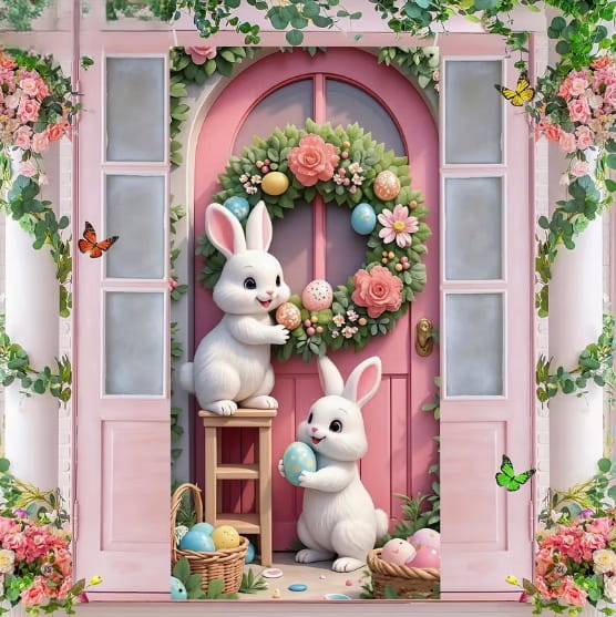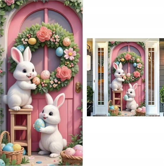 Płaski baner dekoracyjny 2D przedstawiający dwa białe zajączki dekorujące wielkanocny wianek na drzwiach, otoczone kolorowymi jajkami, koszyczkami i wiosennymi kwiatami. Pastelowa kolorystyka, delikatne detale i bajkowy styl sprawiają, że baner doskonale komponuje się z wielkanocnymi aranżacjami.