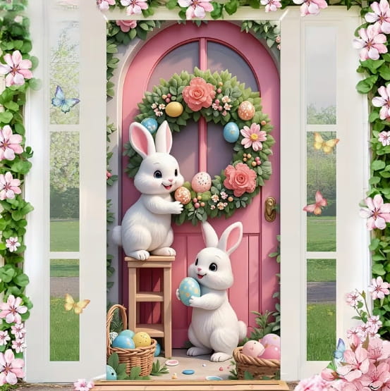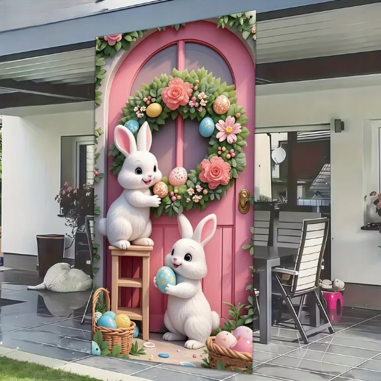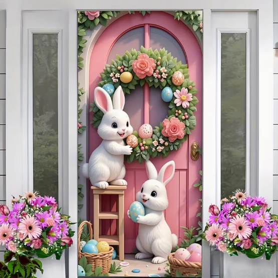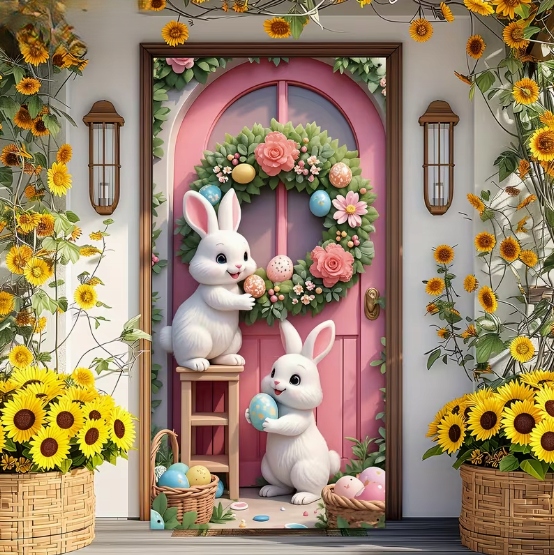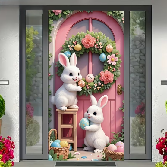 Stwórz magiczną, wiosenną atmosferę już od progu domu. Ten baner wielkanocny na drzwi z motywem dwóch białych zajączków wśród pisanek i kwiatów to idealna dekoracja na Wielkanoc – radosna, ciepła i pełna uroku.