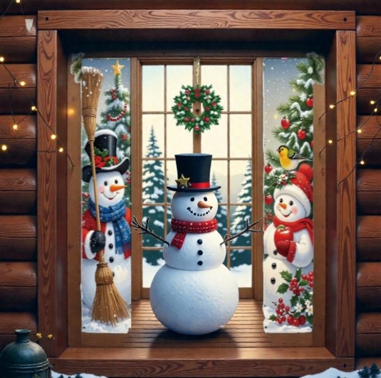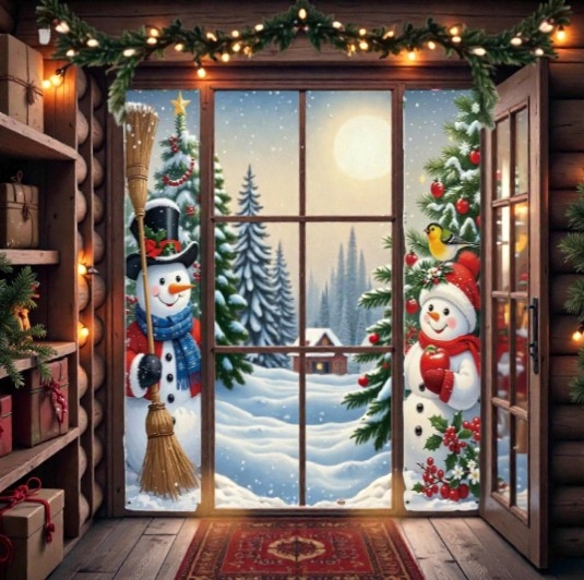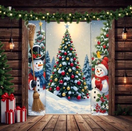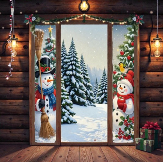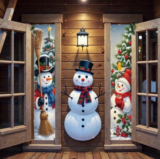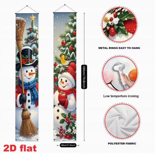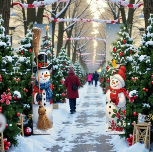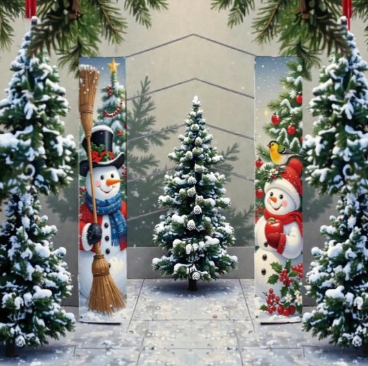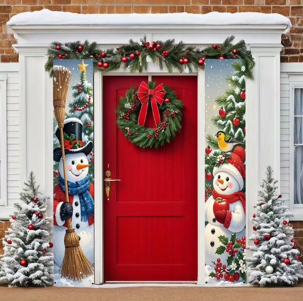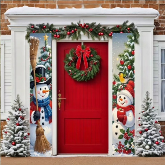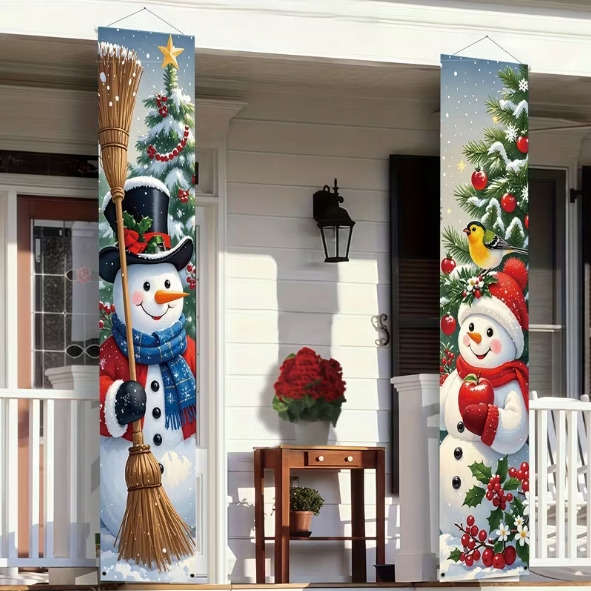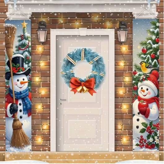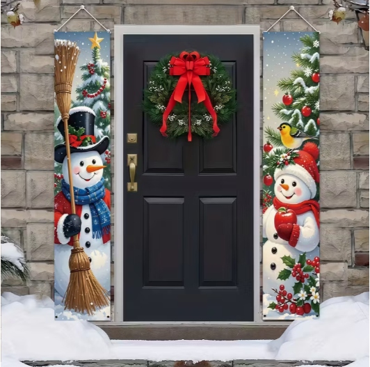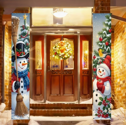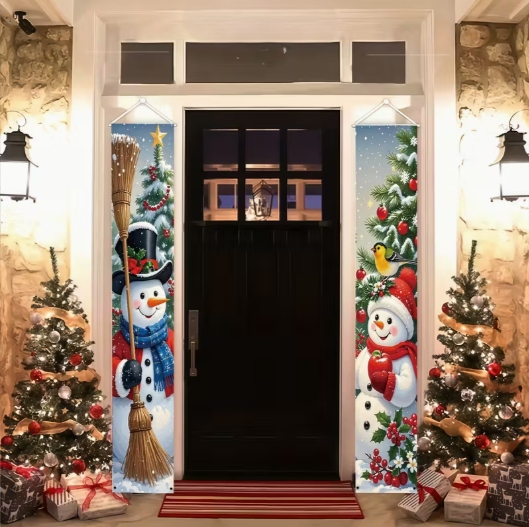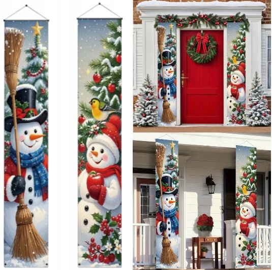 Ten zestaw dwóch wąskich banerów świątecznych z wizerunkiem Dwóch Bałwanków idealnie nadaje się do zawieszenia po obu stronach drzwi — zarówno wejściowych, jak i pokojowych.