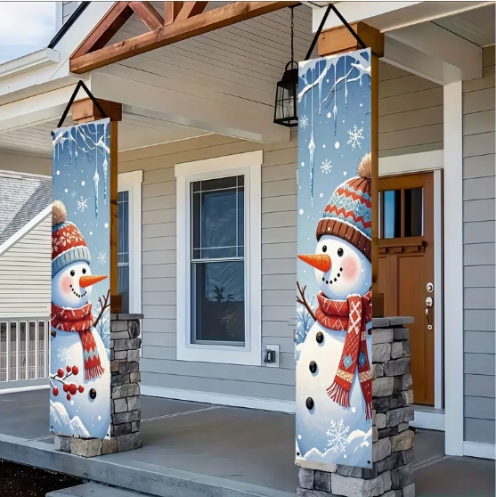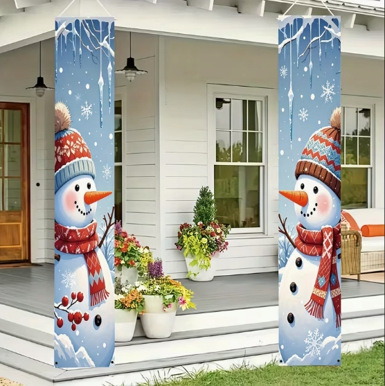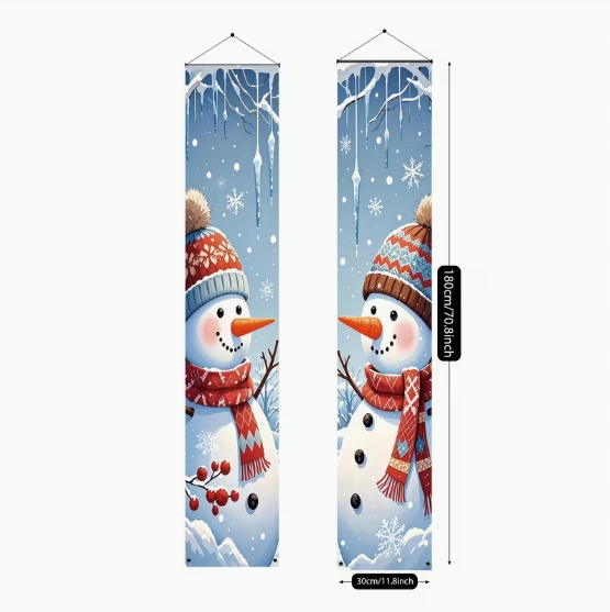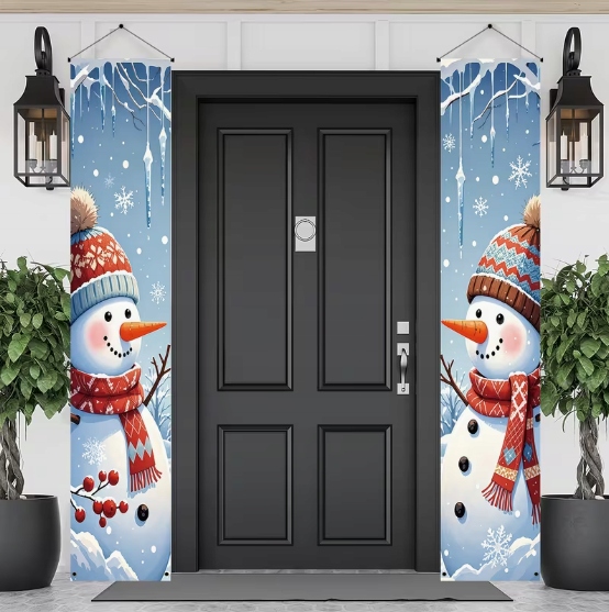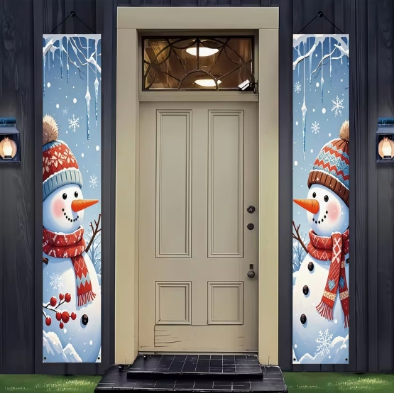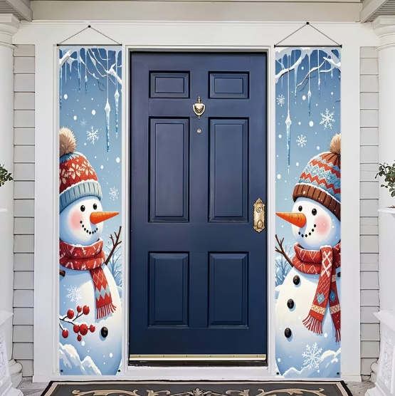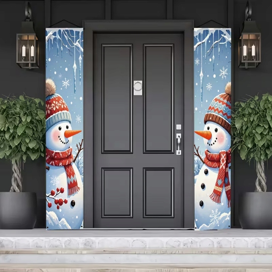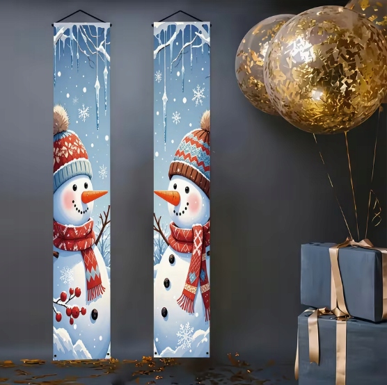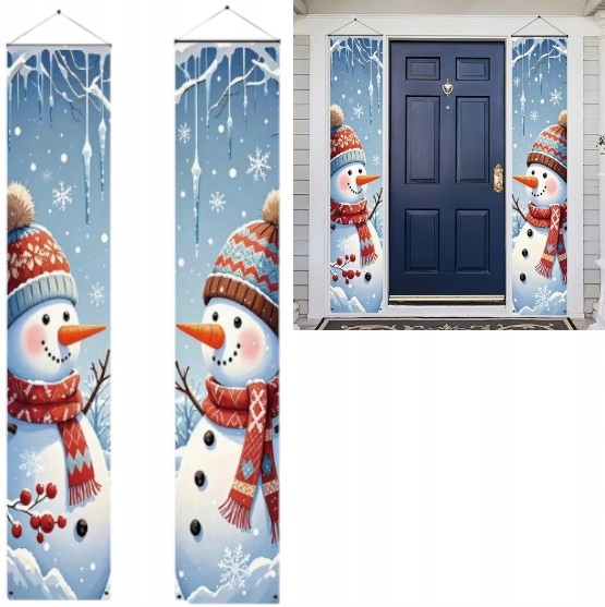 Ten zestaw dwóch wąskich banerów świątecznych z wizerunkiem Dwóch Bałwanków idealnie nadaje się do zawieszenia po obu stronach drzwi — zarówno wejściowych, jak i pokojowych.