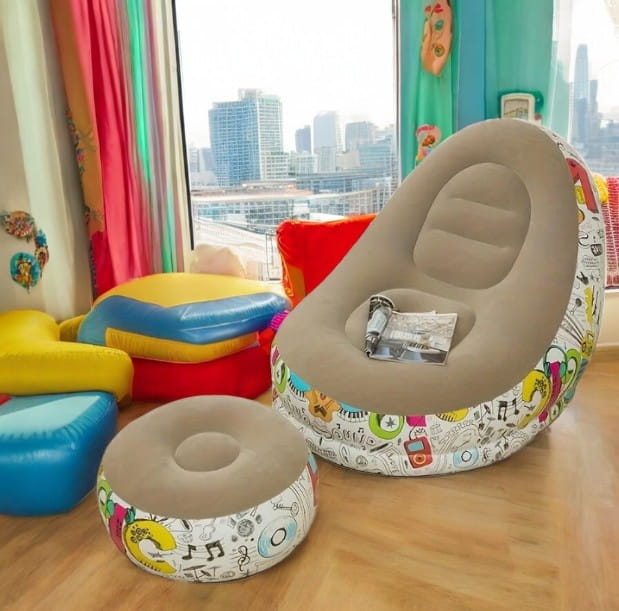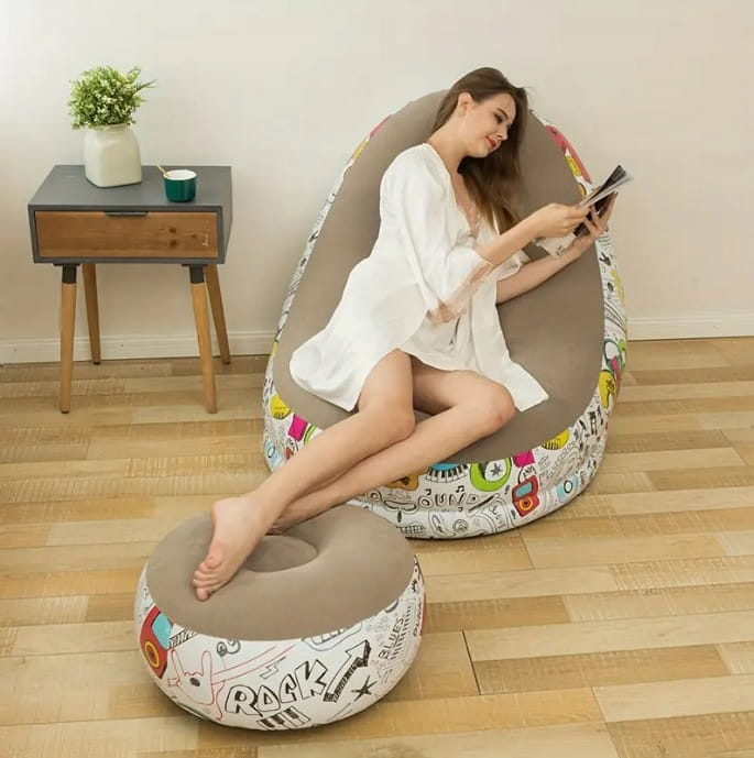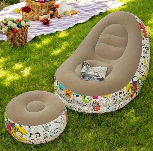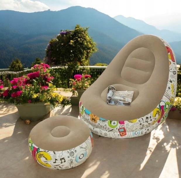 Fotel dmuchany z podnóżkiem nadaje się do domu, na taras, balkon lub do ogrodu. Możesz go także zabrać na wakacje, plażę, camping czy piknik.
