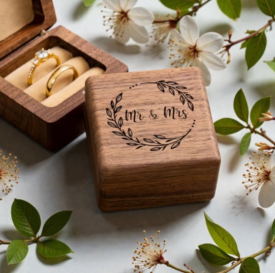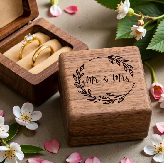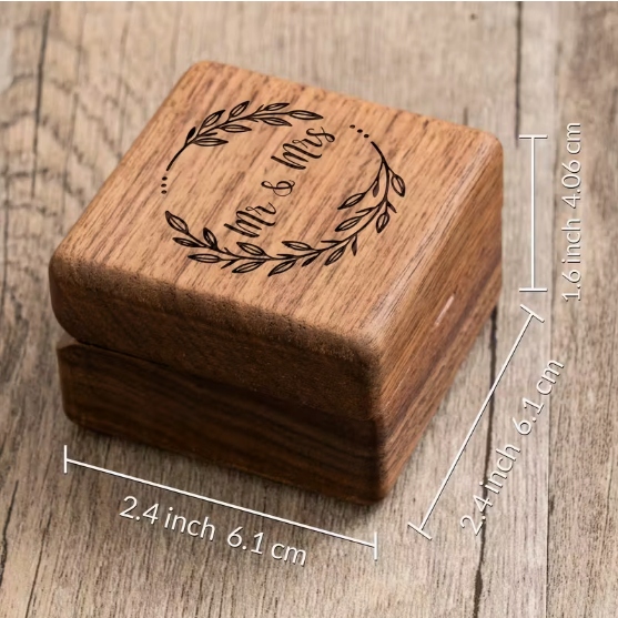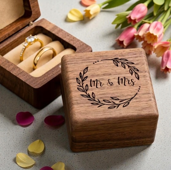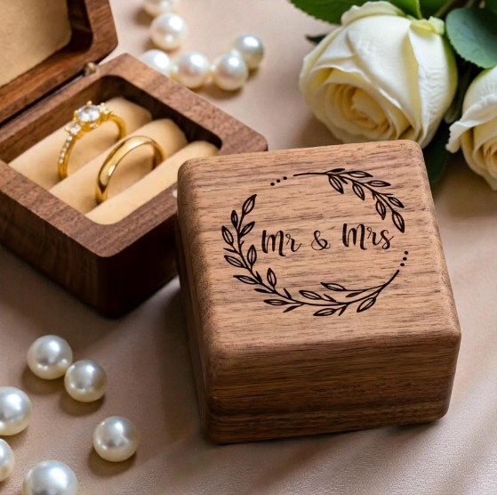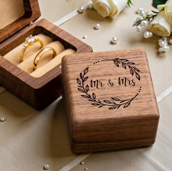 Eleganckie pudełko na obrączki wykonane z naturalnego orzechowego drewna to wyjątkowy dodatek na ślub, zaręczyny oraz rocznice. Ozdobione subtelnym grawerem „Mr & Mrs” w dekoracyjnym wianku, łączy klasykę z rustykalnym urokiem.