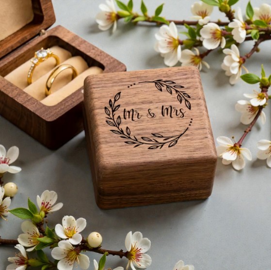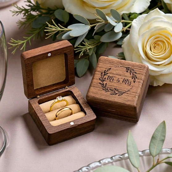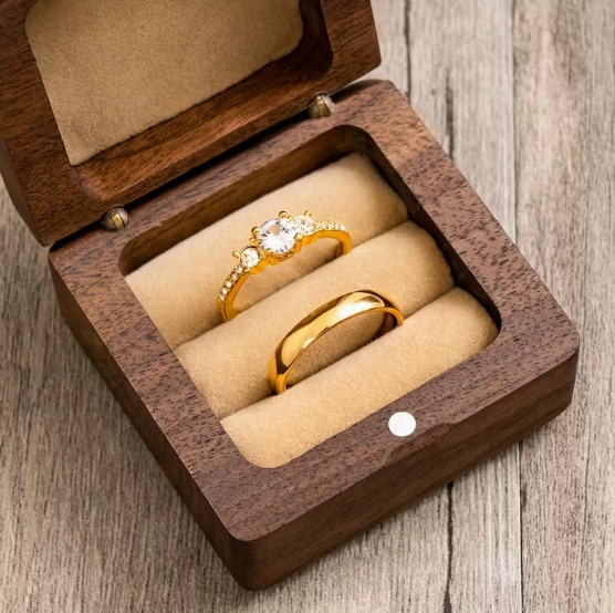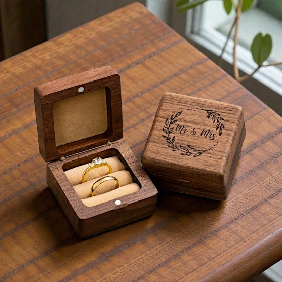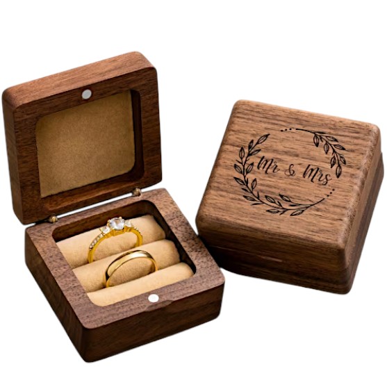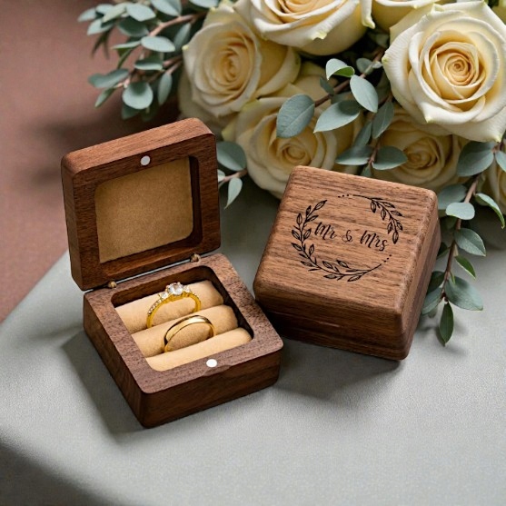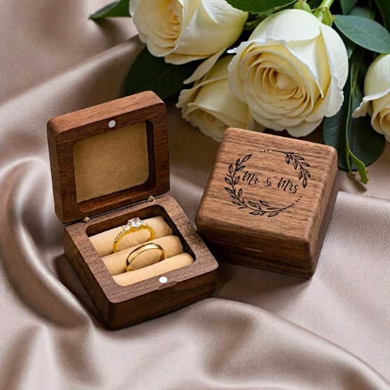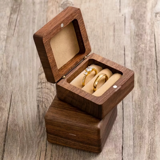 Drewniane pudełko na obrączki ślubne z orzechowego drewna – eleganckie etui dla Pary Młodej