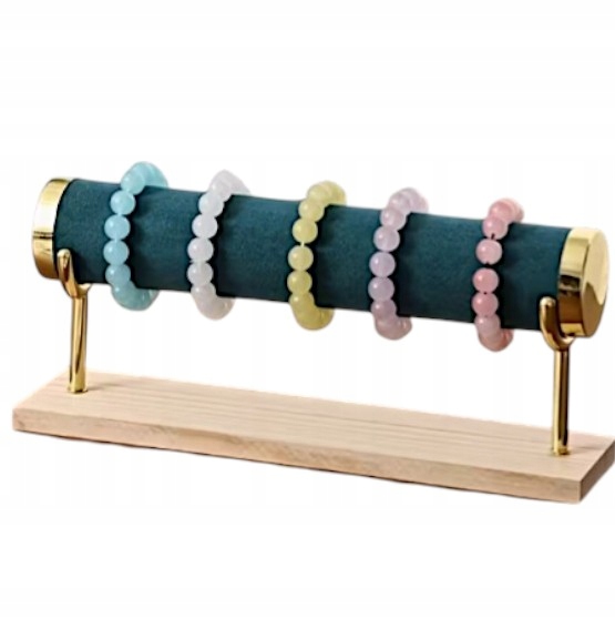 Elegancki i nowoczesny ekspozytor na bransoletki lub zegarki pokryty przyjemną w dotyku tkaniną w kolorze zielonym, co nadaje mu niepowtarzalny charakter.