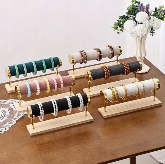 Elegancki i nowoczesny stojak na bransoletki lub zegarki pokryty przyjemną w dotyku tkaniną w kolorze zielonym.