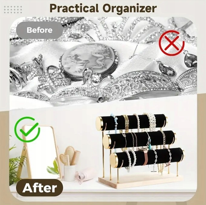 Elegancki stojak na biżuterię to niezbędny gadżet dla każdej kobiety, która chce zrobić porządek w swojej kolekcji bransoletek, zegarków oraz innej biżuterii i wyeksponować je w estetyczny i luksusowy sposób. Już nigdy więcej Twoja biżuteria nie będzie się plątać, a Ty będziesz mieć szybki i łatwy do niej dostęp.