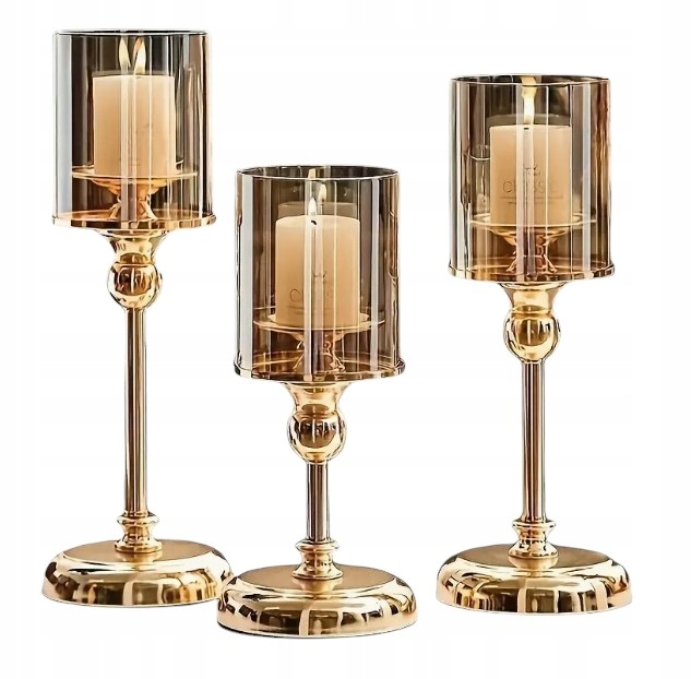 ELEGANCKI ZESTAW 3 SZTUK ZŁOTYCH SZKLANYCH ŚWIECZNIKÓW