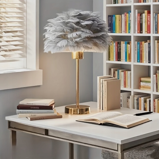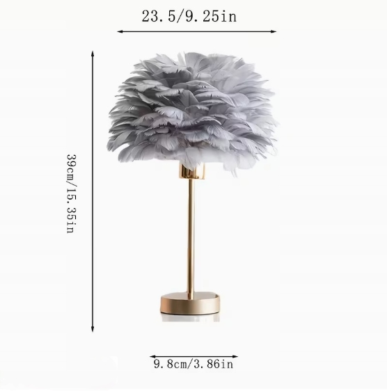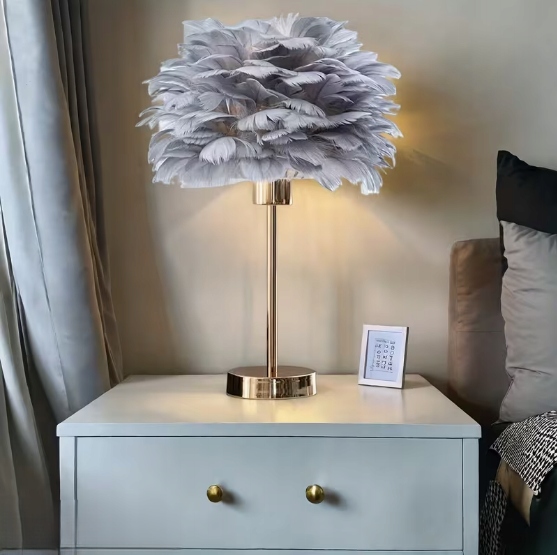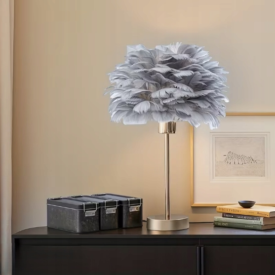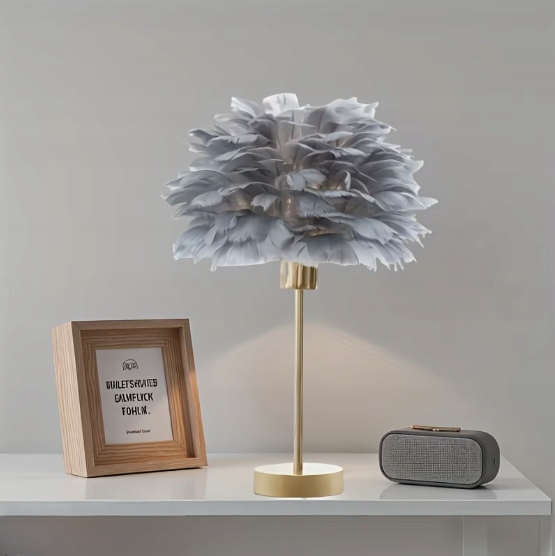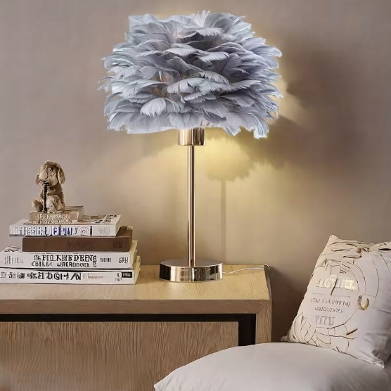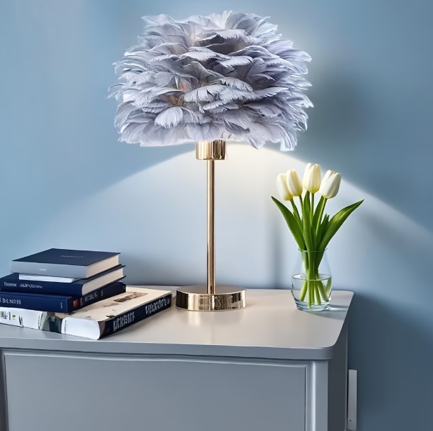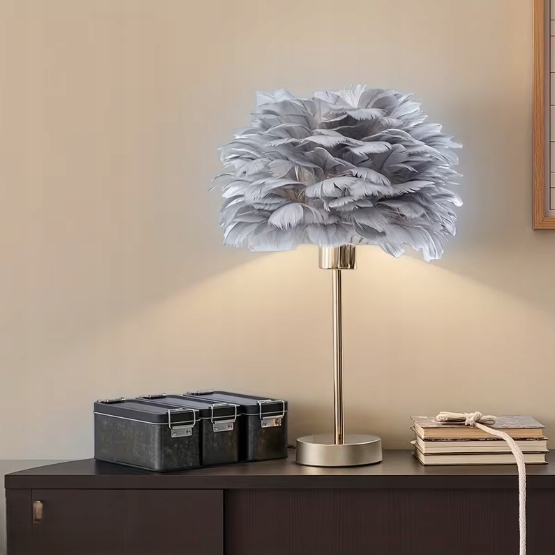 Lampka nocna z kloszem z szarych piór idealnie wpasuje się do każdego pomieszczenia i aranżacji, zachwycając nie tylko nowoczesnym i eleganckim wyglądem, ale także funkcjonalnością. Piękna lampka nocna do sypialni, salonu, biura czy stworzenia klimatycznej atmosfery w gabinecie.