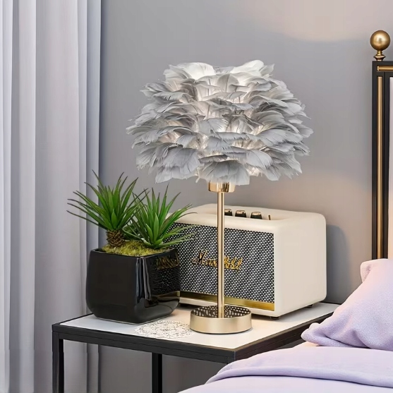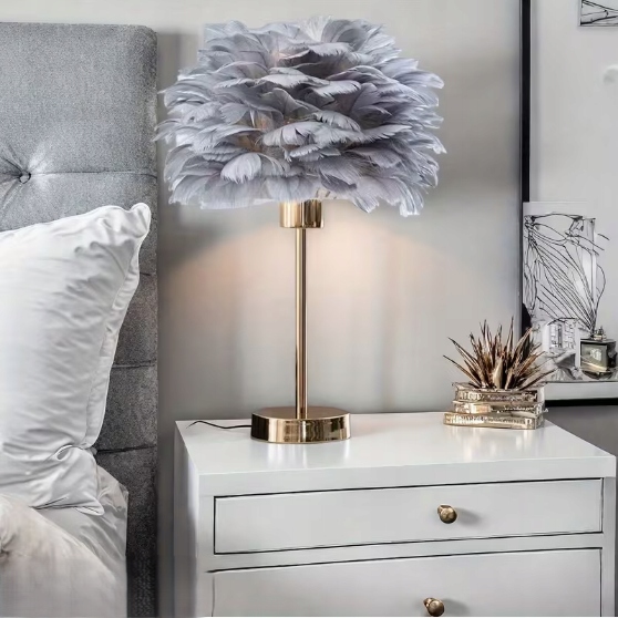 Elegancka lampa nocna stołowa z kloszem z szarych piór ściemniacz na komode