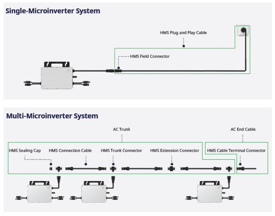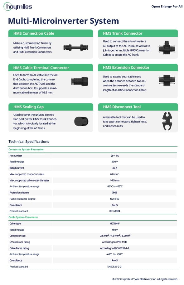 System kabli HMS Flex to rewolucyjne rozwiązanie okablowania zaprojektowane dla mikroinwerterów serii HMS, które mogą być stosowane w systemach fotowoltaicznych z jednym lub wieloma mikroinwerterami. To bardzo prosty i przyjazny system dla użytkownika a konstrukcja typu plug and play sprawia, że instalacja jest łatwiejsza, szybsza i niezawodna.