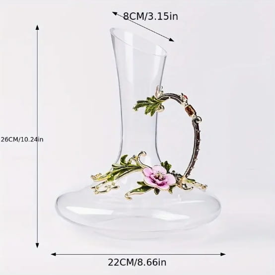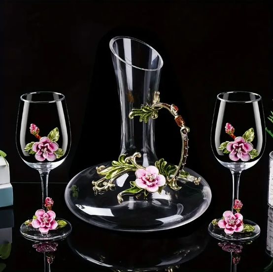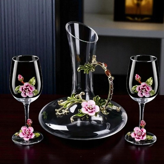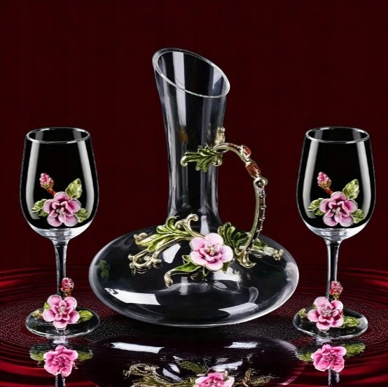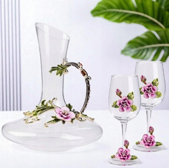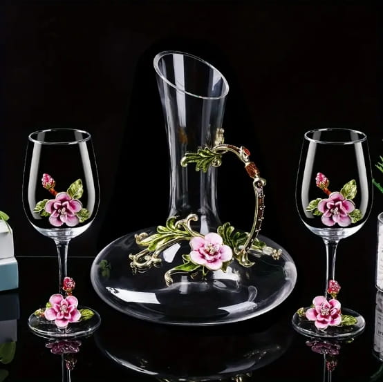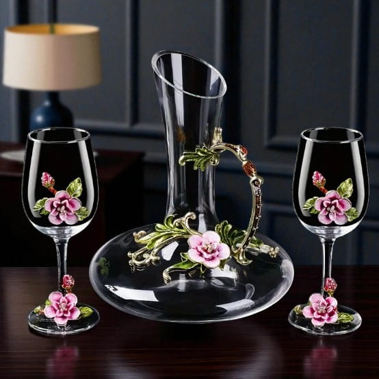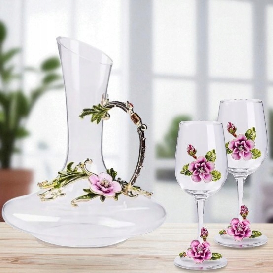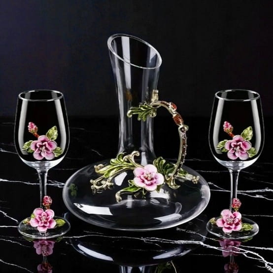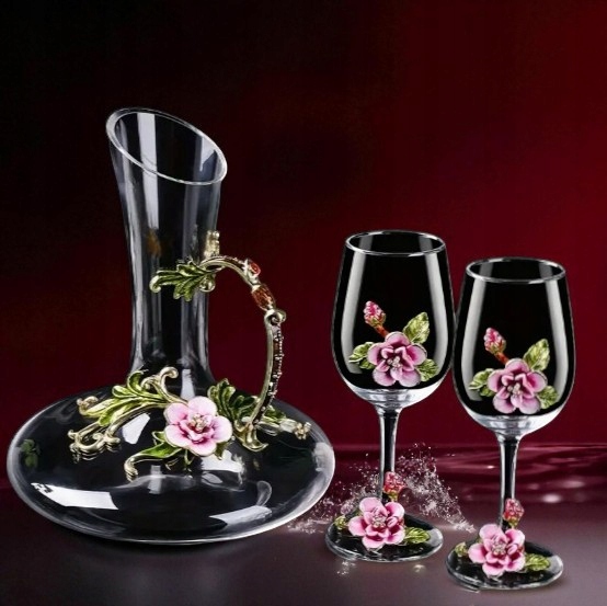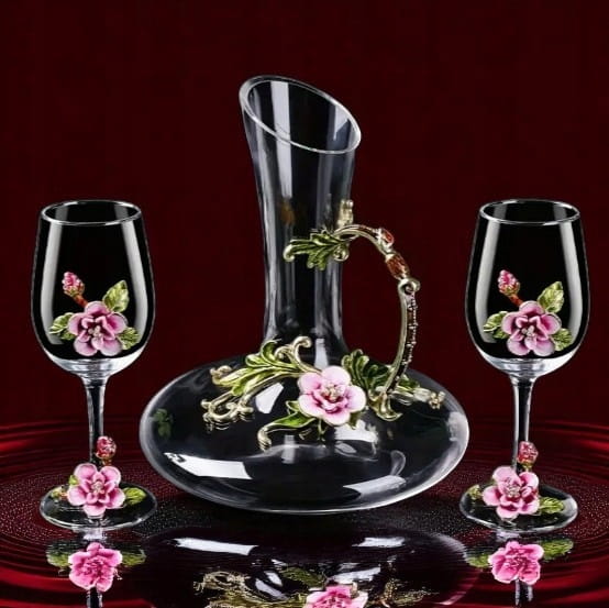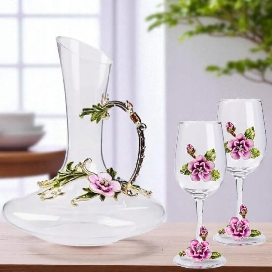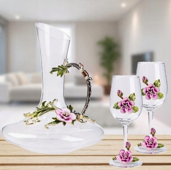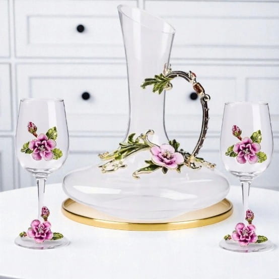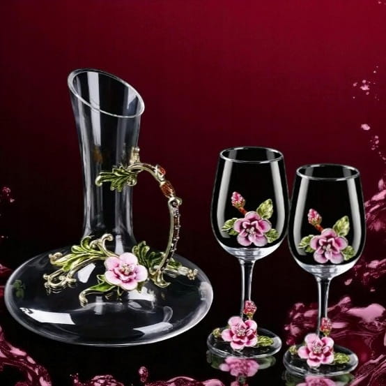 Prezentujemy unikalny komplet: karafka o pojemności 1500 ml oraz 2 kieliszki do czerwonego wina (każdy po 250 ml), ozdobne z motywem Kwiata Śliwy.