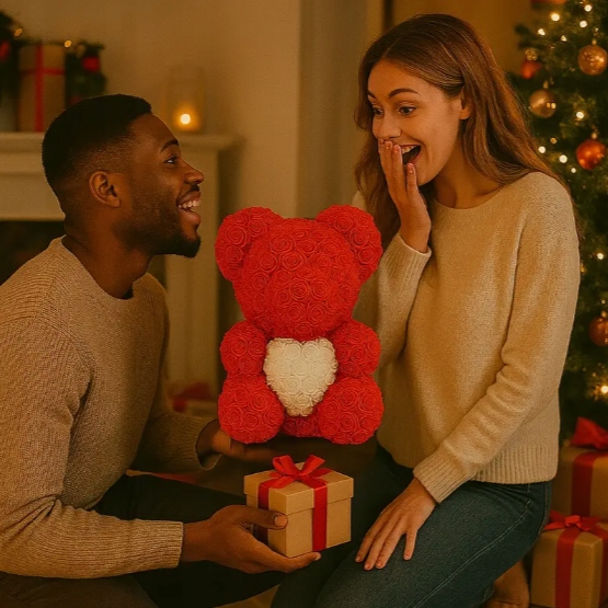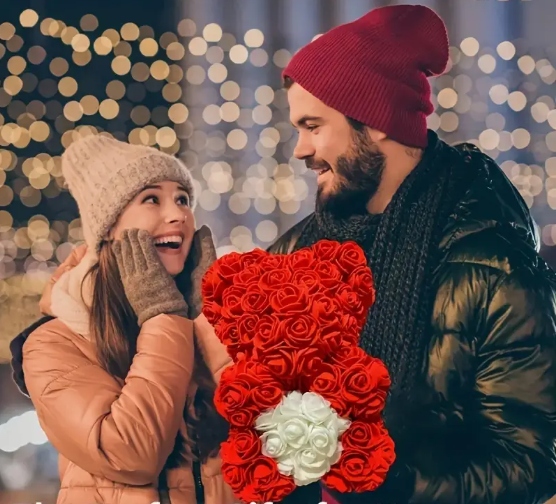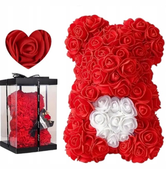Miś kwiatowy z czerwonych róż z sercem Pudełko Prezentowe Walentynki Róże