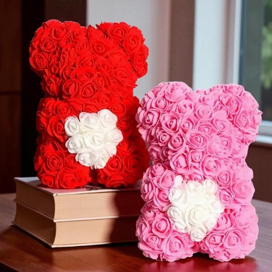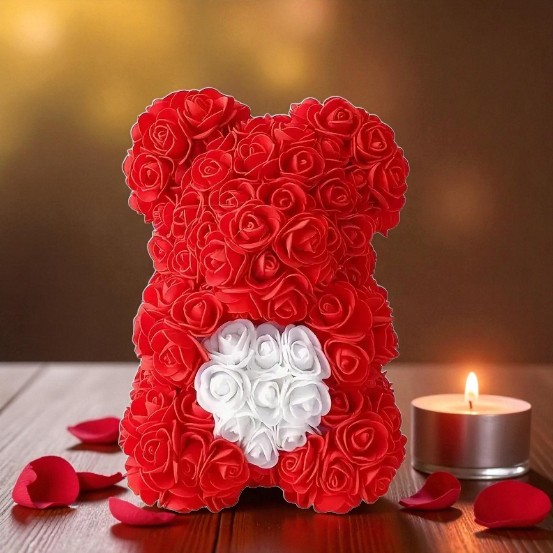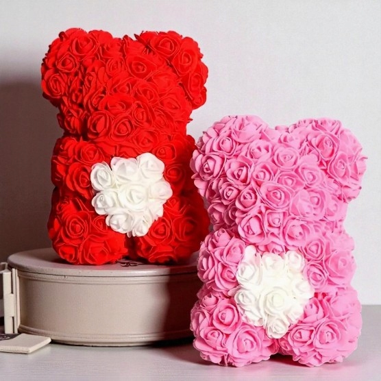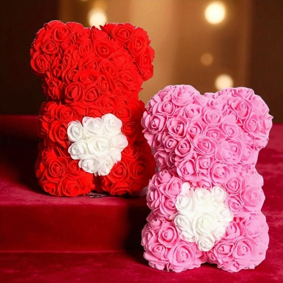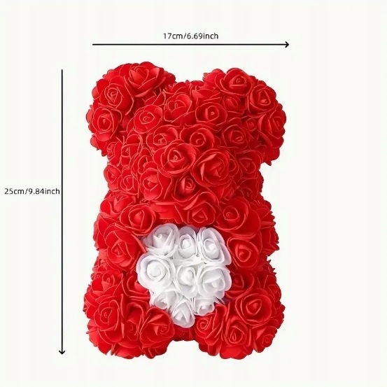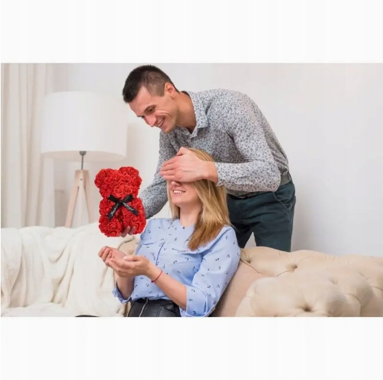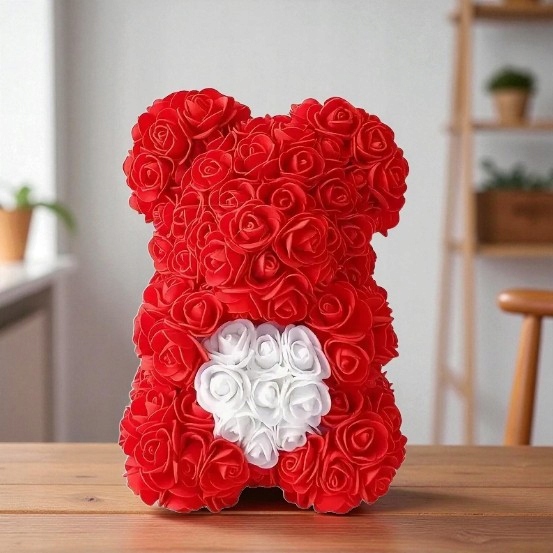 Delikatny, elegancki i pełen uroku upominek, który idealnie podkreśla romantyczny charakter każdej okazji. Ten wyjątkowy miś wykonany jest ze sztucznej pianki róż w głębokiej czerwieni, a jego serce ozdobione jest białymi perełkami, dzięki czemu prezentuje się niezwykle subtelnie i luksusowo. To idealny prezent na Walentynki, Dzień Kobiet, Dzień Matki, urodziny, rocznice, a także znakomita dekoracja na wesele, chrzciny, imprezy okolicznościowe czy upominek świąteczny.