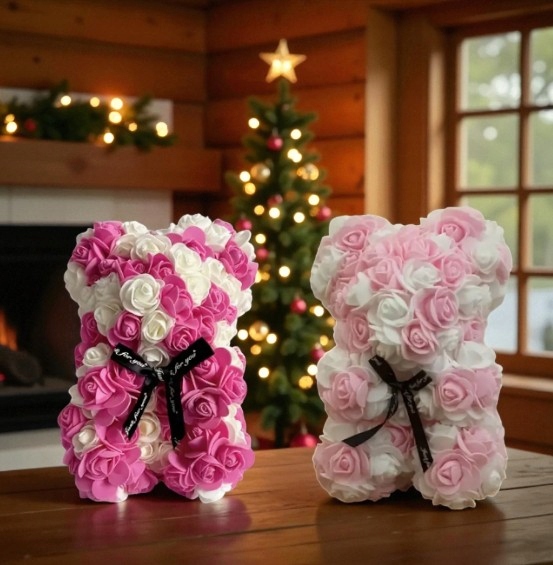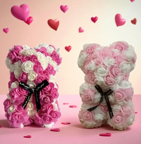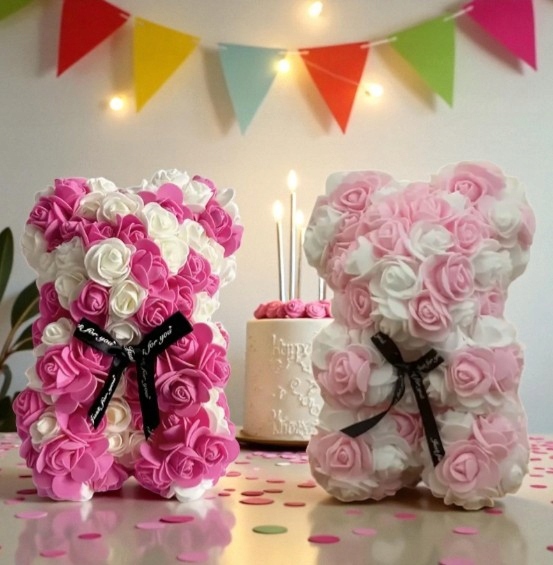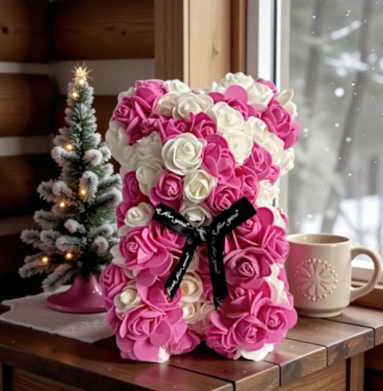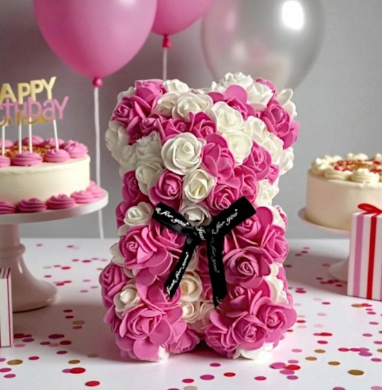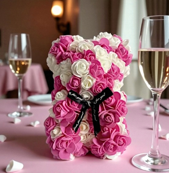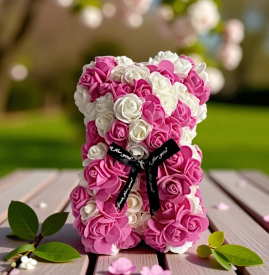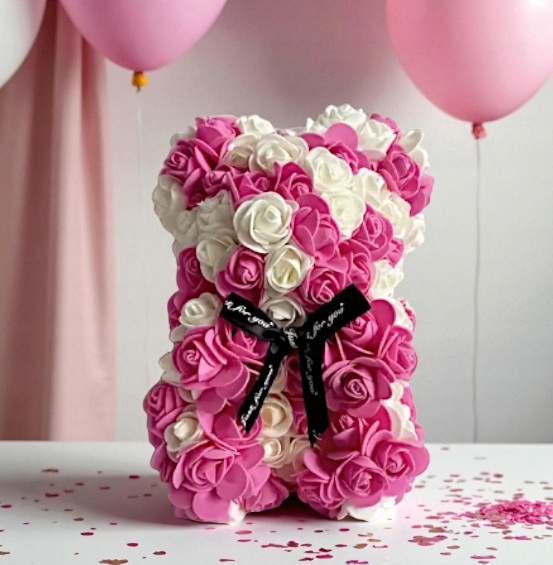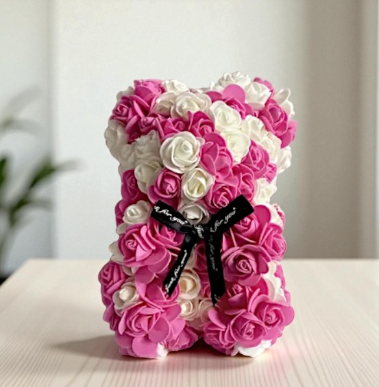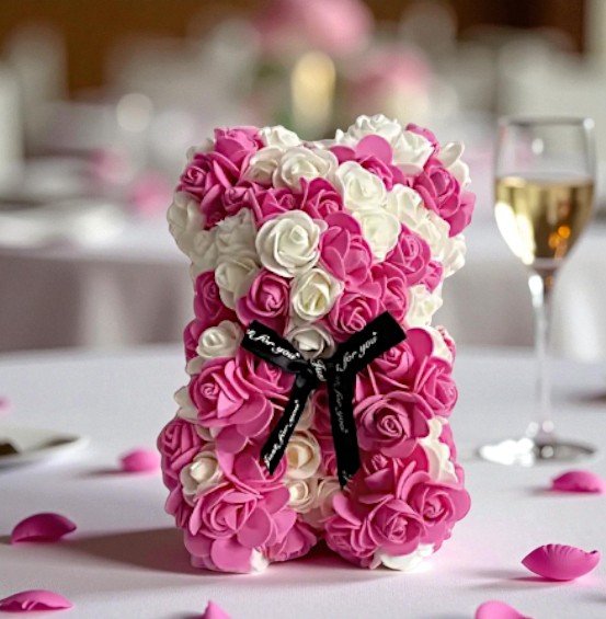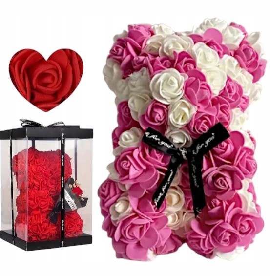 Wyjątkowy, elegancki i pełen uroku prezent, który zachwyci od pierwszego spojrzenia. Ten uroczy miś wykonany jest z piankowych róż w połączeniu bieli i ciemnego różu, tworząc efektowną i romantyczną kompozycję. Ozdobiony stylową wstążką z napisem „Just for You”, idealnie sprawdzi się jako wyraz miłości, wdzięczności lub ciepłych uczuć. Doskonały na Walentynki, Dzień Matki, Dzień Kobiet, urodziny, rocznice, a także jako dekoracyjny element na wesele, przyjęcia, chrzciny czy prezent świąteczny.