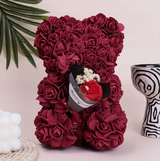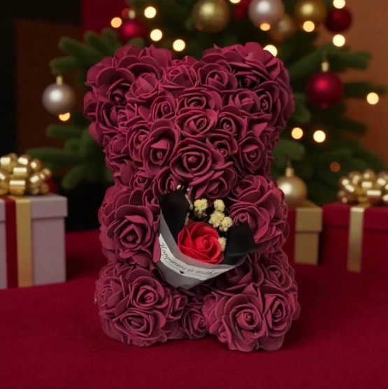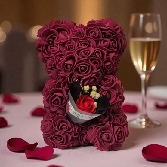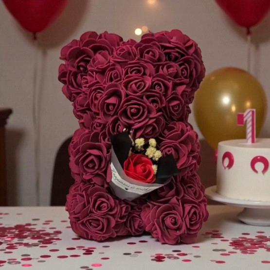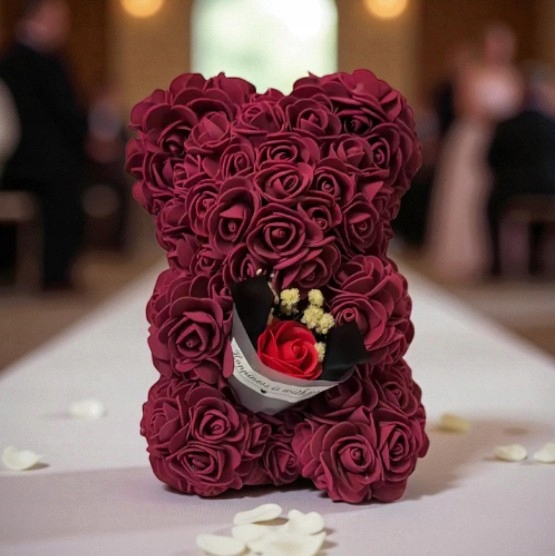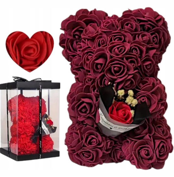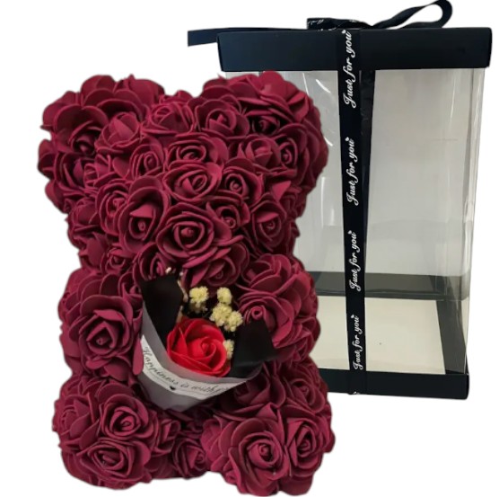 Miś z Bordowych Róż z Bukietem + Pudełko Prezentowe – 24 cm