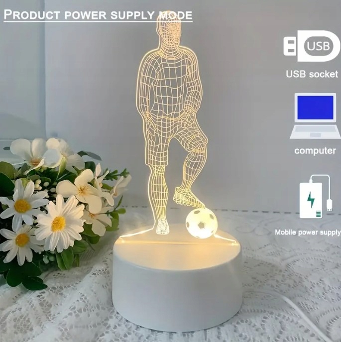 Nowoczesna lampa stołowa 3D w kształcie piłkarza daje ciepłe światło łagodne dla oczu, jest energooszczędna i zasilana przez USB.