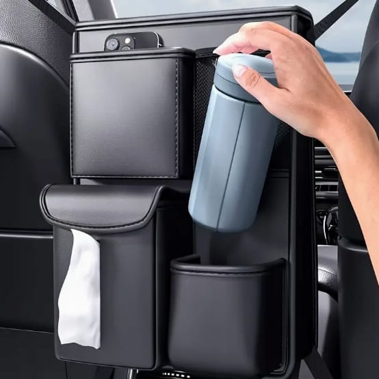 Organizer do samochodu na przedni fotel z ekoskóry to praktyczny i wielofunkcyjny a zarazem elegancki element wyposażenia samochodu, który pomaga utrzymać ład i porządek wewnątrz pojazdu. Wszystkie niezbędne rzeczy będą poukładane i zawsze na wyciągnięcie ręki.
