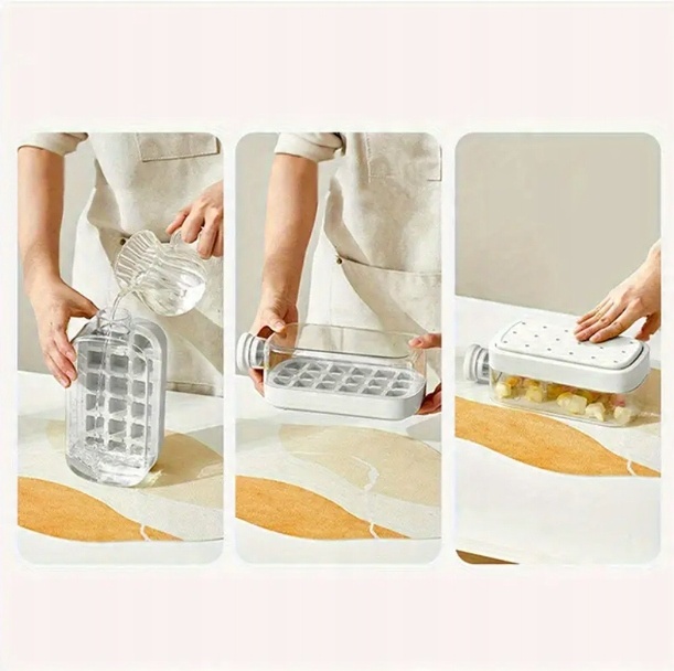 Pojemnik może pomieścić 18 kostek lodu na raz, wystarczy wlać wodę maksymalnie do wyznaczonego miejsca pojemnika, a następnie zamknąć butelkę i poziomo włożyć do zamrażalnika.