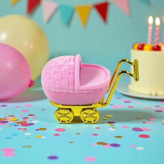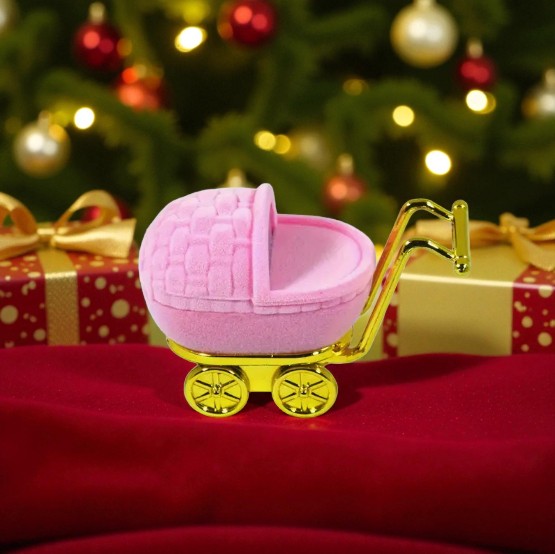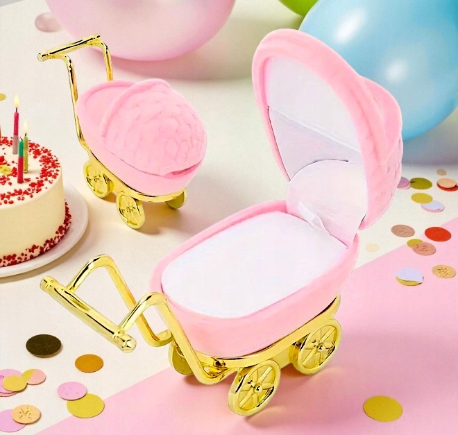 Wyjątkowe pudełko na biżuterię w kształcie uroczego wózka dziecięcego to idealny sposób, aby nadać prezentowi niepowtarzalny urok. Wykonane z miękkiego, przyjemnego w dotyku weluru w kolorze różowym, ze złotymi detalami z trwałego PCV – prezentuje się niezwykle stylowo i przyciąga wzrok.