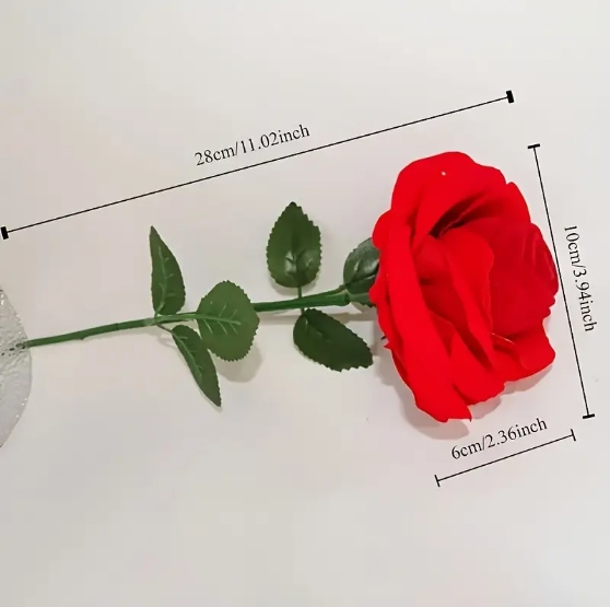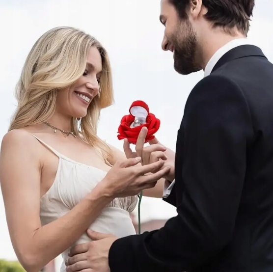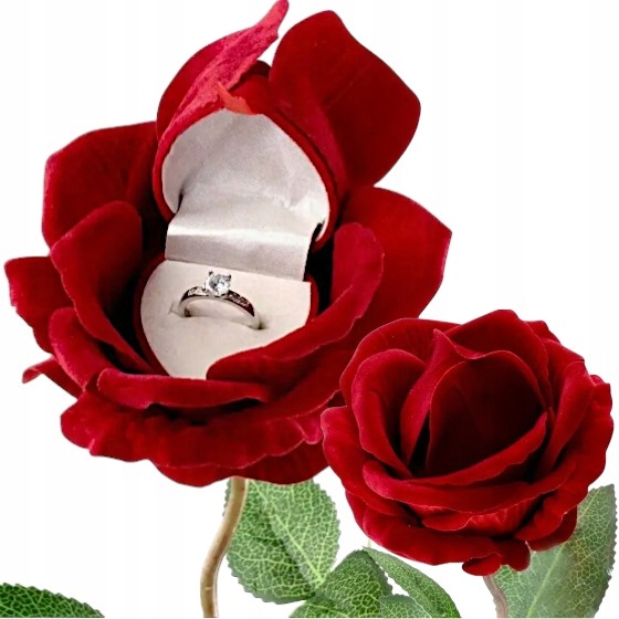 To pudełko na pierścionek w kształcie czerwonej róży zachwyca swoim wyglądem i elegancją. Wykonane z dbałością o detale, posiada miękki welurowy materiał i realistyczną długą łodygę z zielonymi liśćmi, dzięki czemu wygląda jak prawdziwy kwiat.