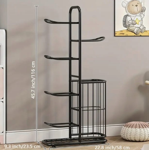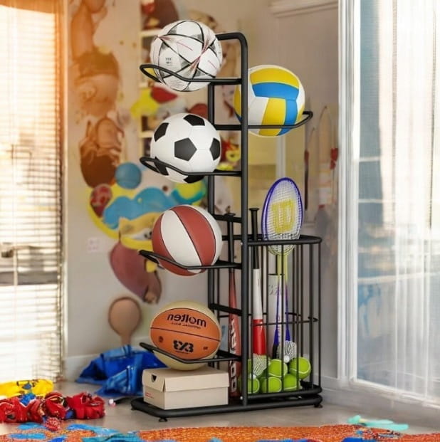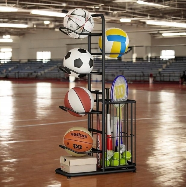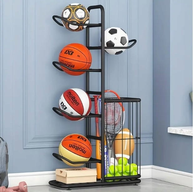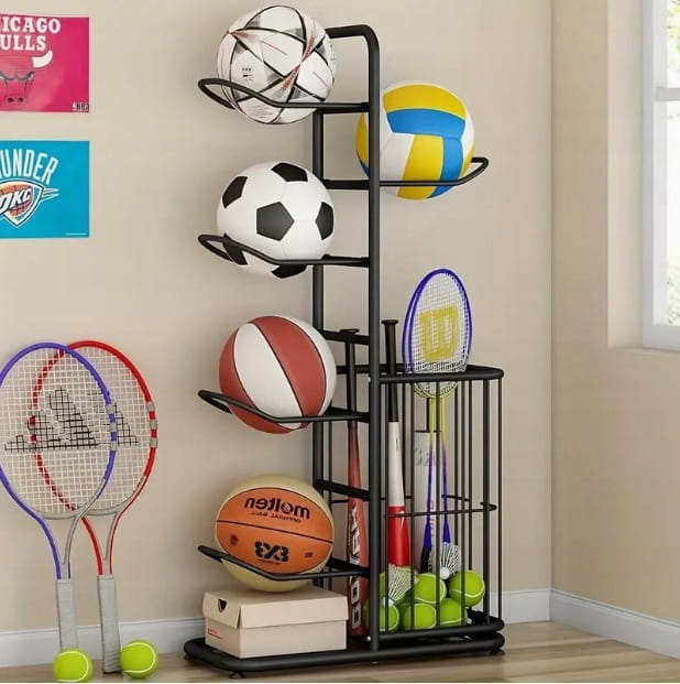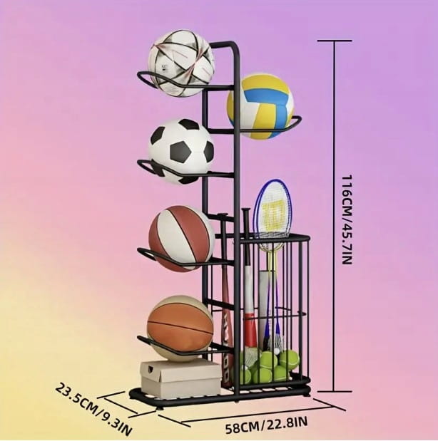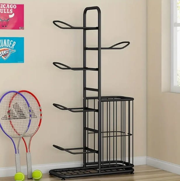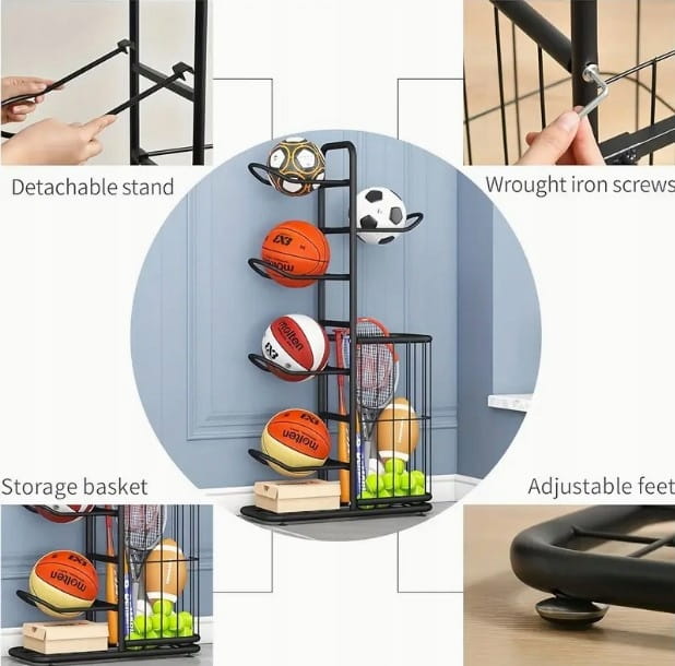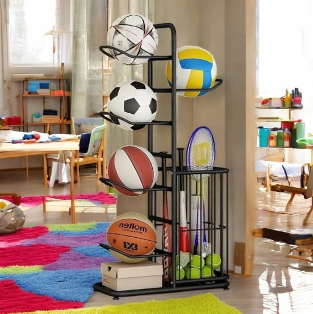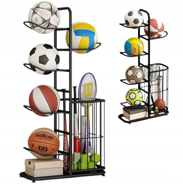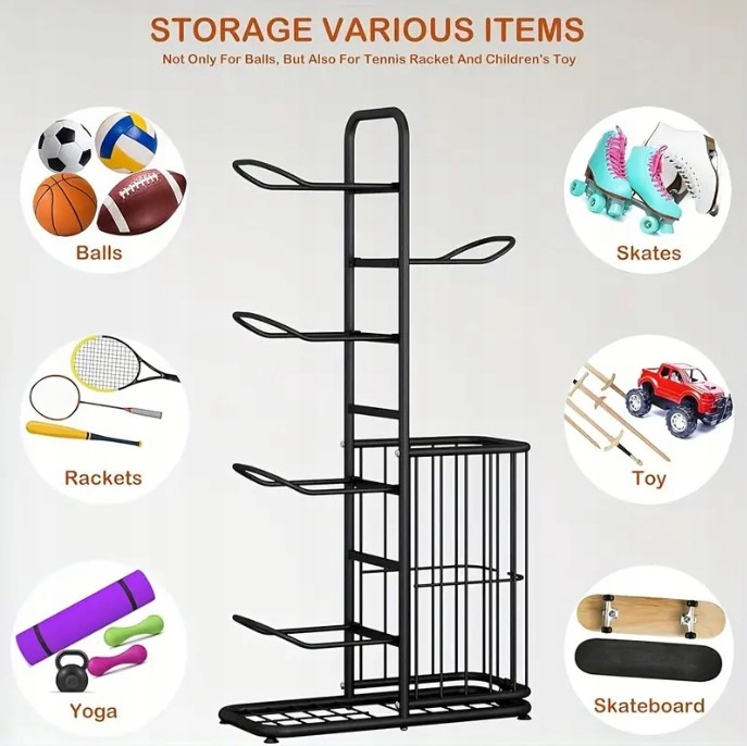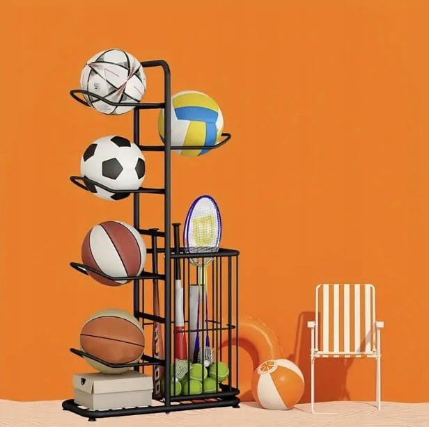 Metalowy stojak, ze stabilną podstawą pomaga uporządkować akcesoria sportowe, nie tylko różnego rodzaju piłki lecz również paletki, kijki i różnego rodzaju akcesoria sportowe.