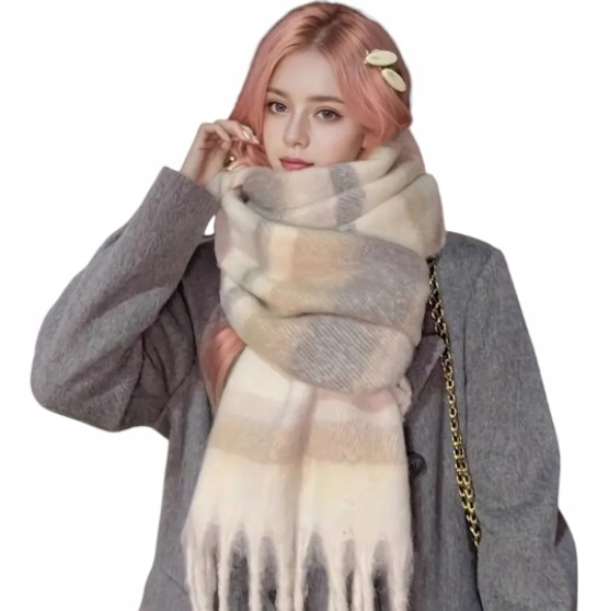 SZALIK DAMSKI SZAL CIEPŁY Z FRĘDZLAMI NA ZIMĘ BEŻOWY PASKI BEŻ CIEPŁY DUŻY