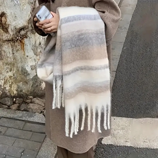 Miękki Zimowy Szalik z Frędzlami - Beżowy w paski | 210x30cm | Ciepły i Elegancki