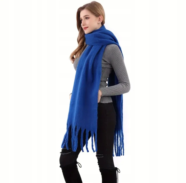 SZALIK DAMSKI SZAL CIEPŁY Z FRĘDZLAMI NA ZIMĘ GŁADKI NIEBIESKI INDYGO