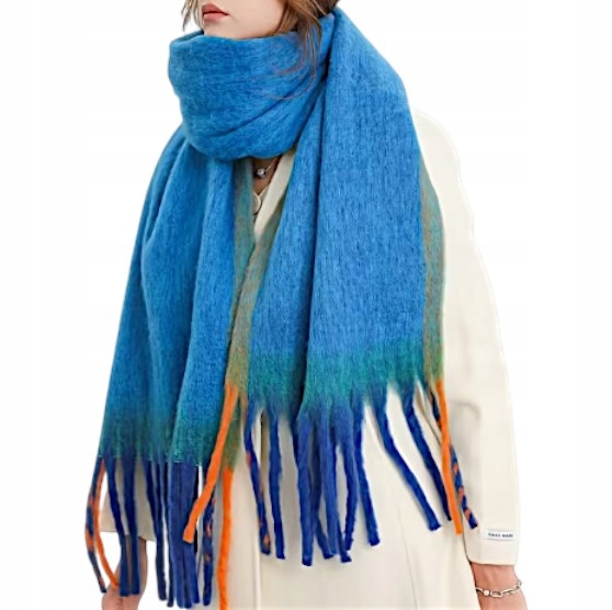 SZALIK DAMSKI SZAL CIEPŁY Z FRĘDZLAMI NA ZIMĘ GŁADKI NIEBIESKI OCEAN