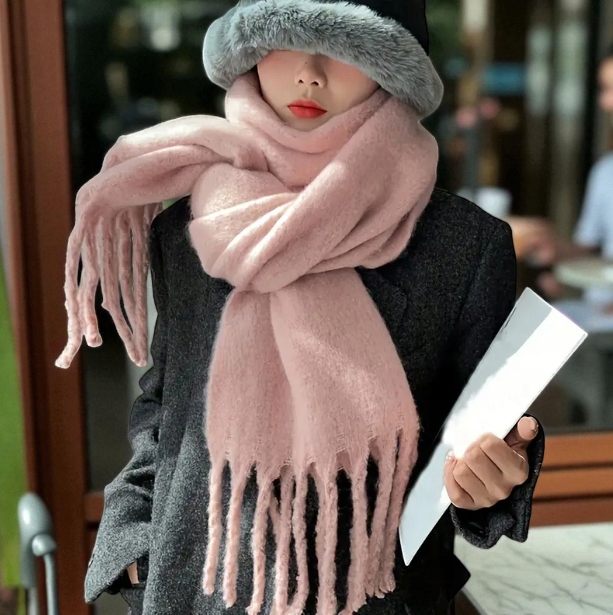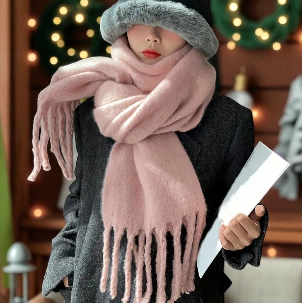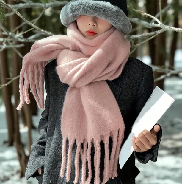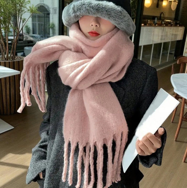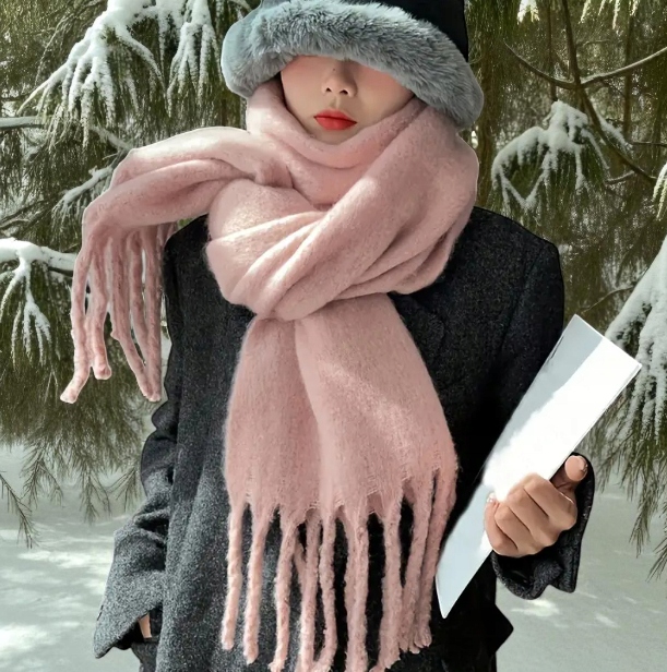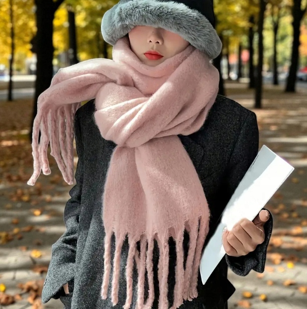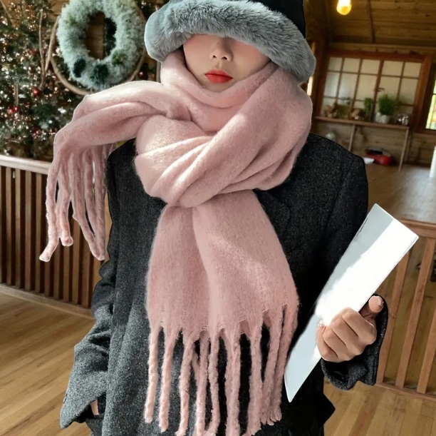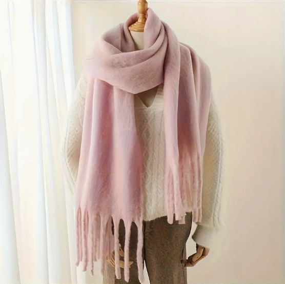 Miękki Zimowy Szalik z Frędzlami - Różowy pastelowy | 190x28cm | Ciepły i Elegancki