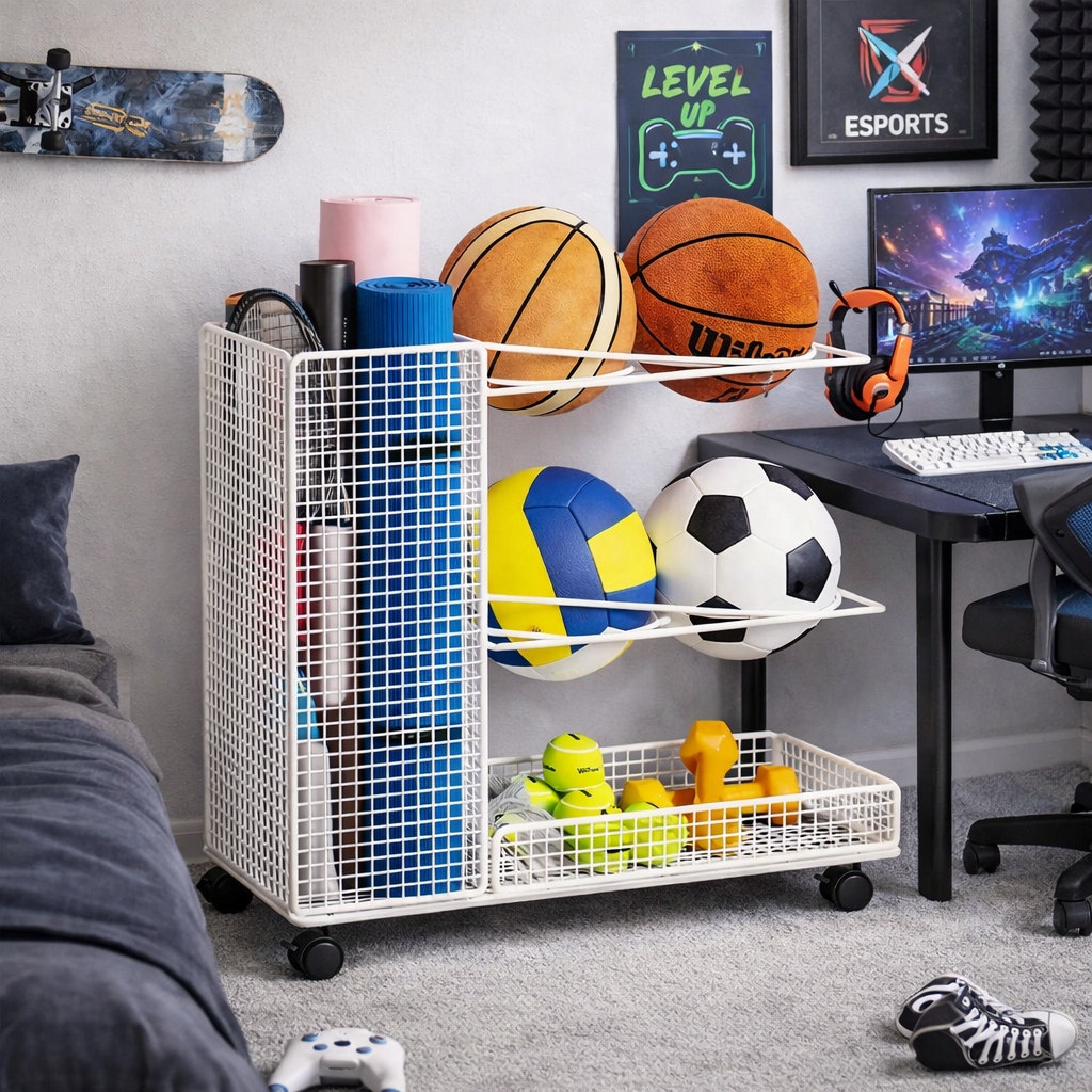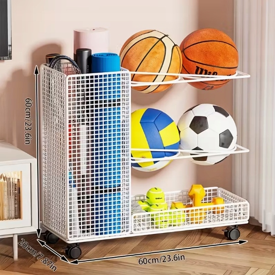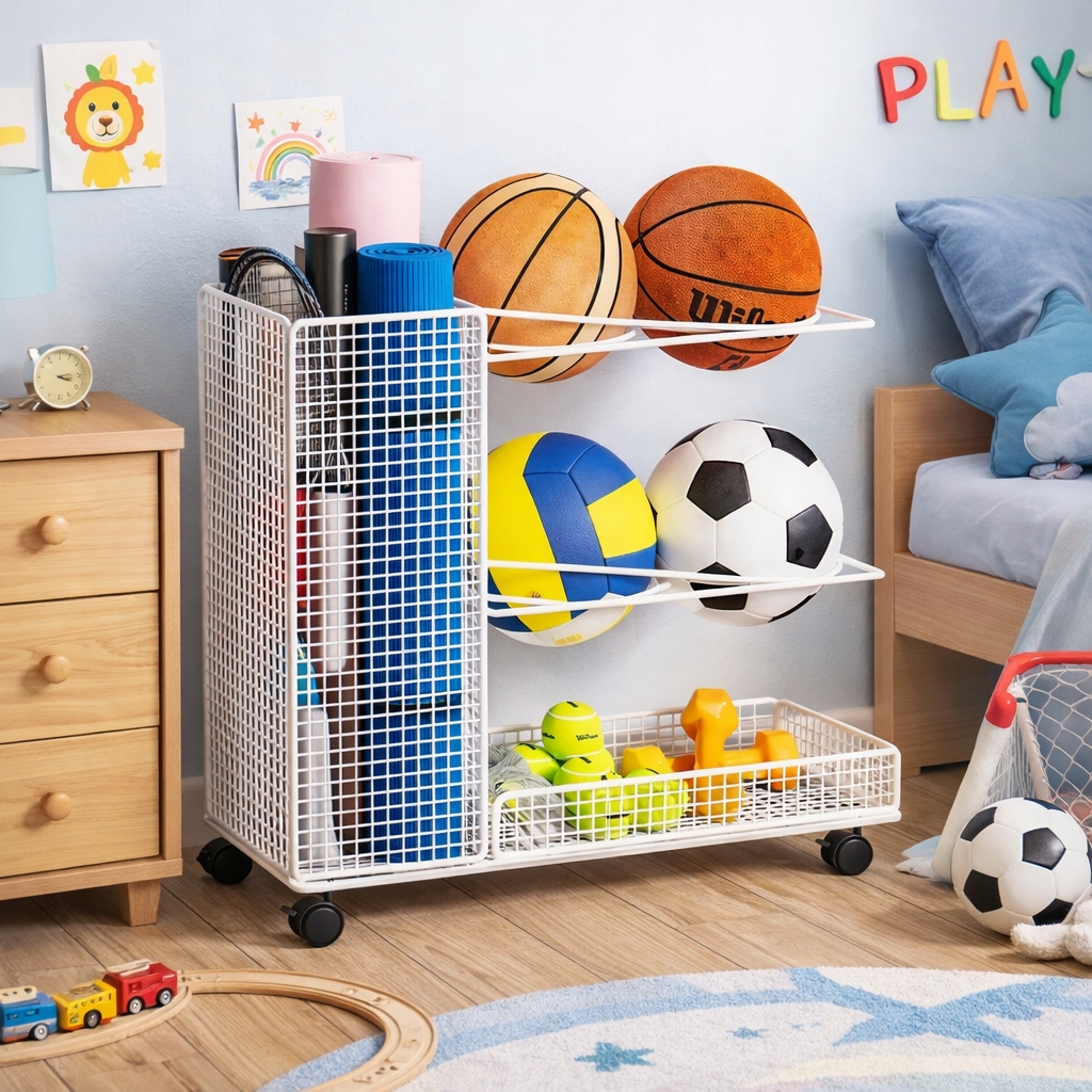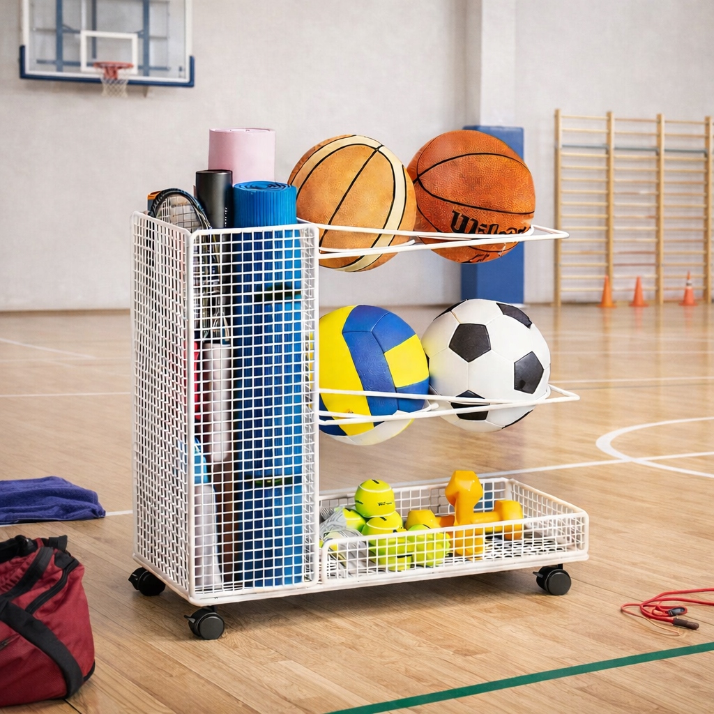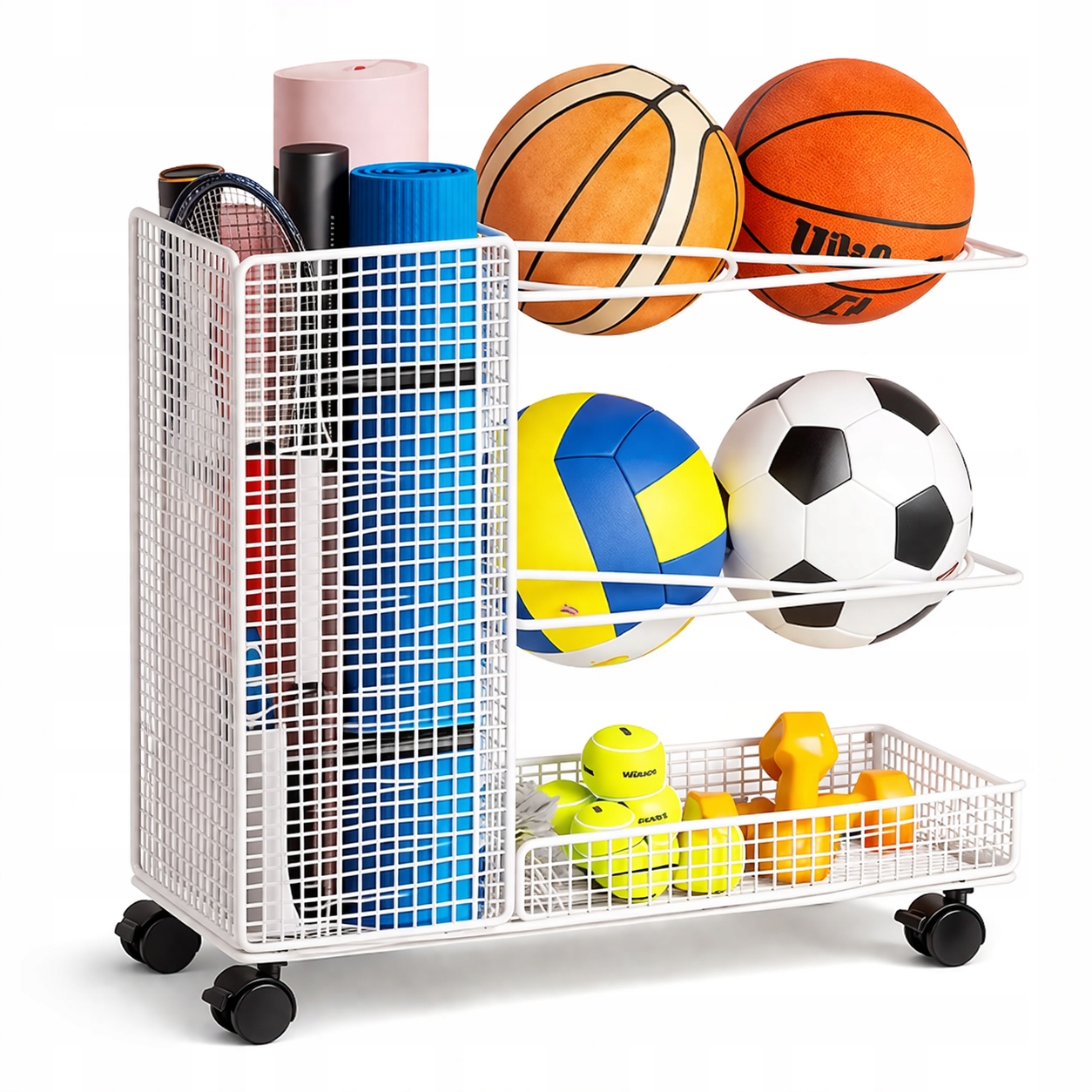 ? Stojak na 4 piłki + organizer sportowy na kółkach – porządek i wygoda w jednym.