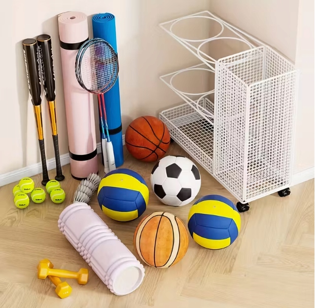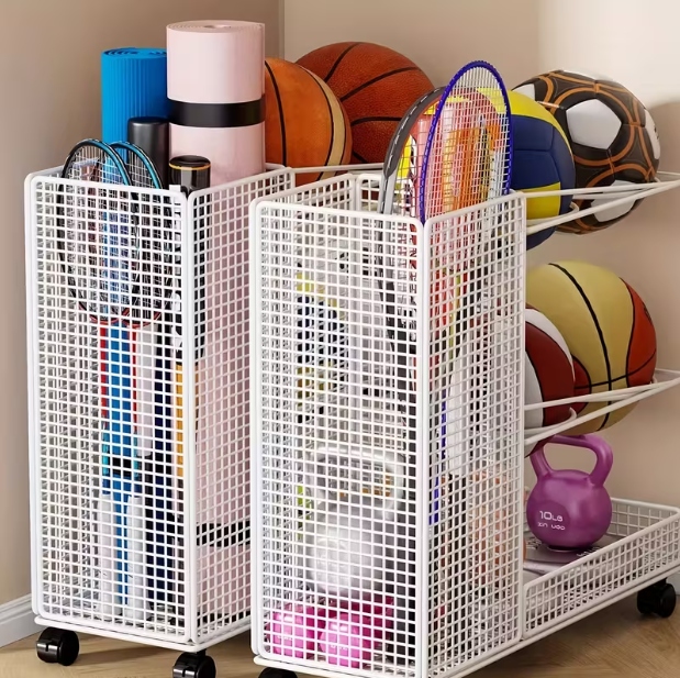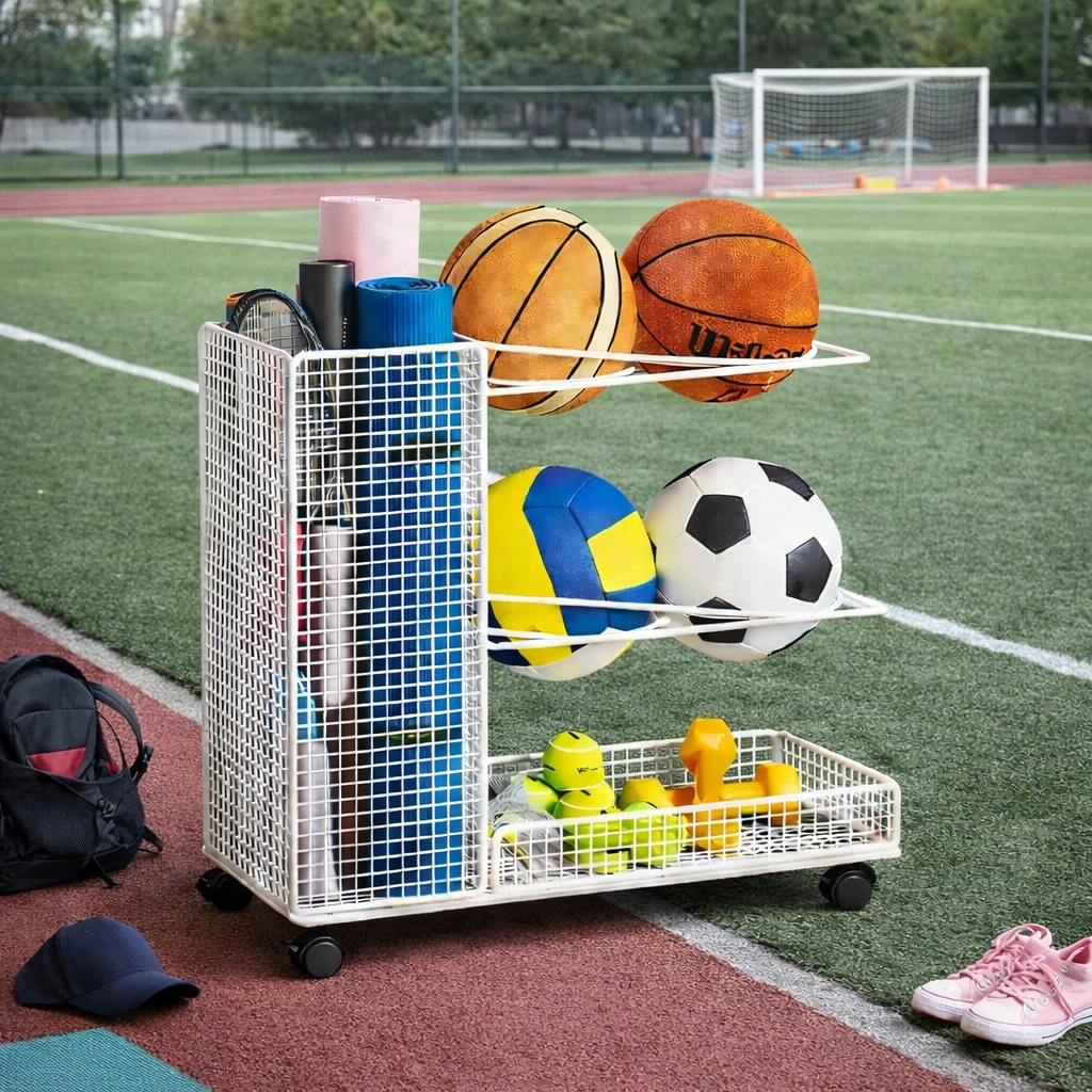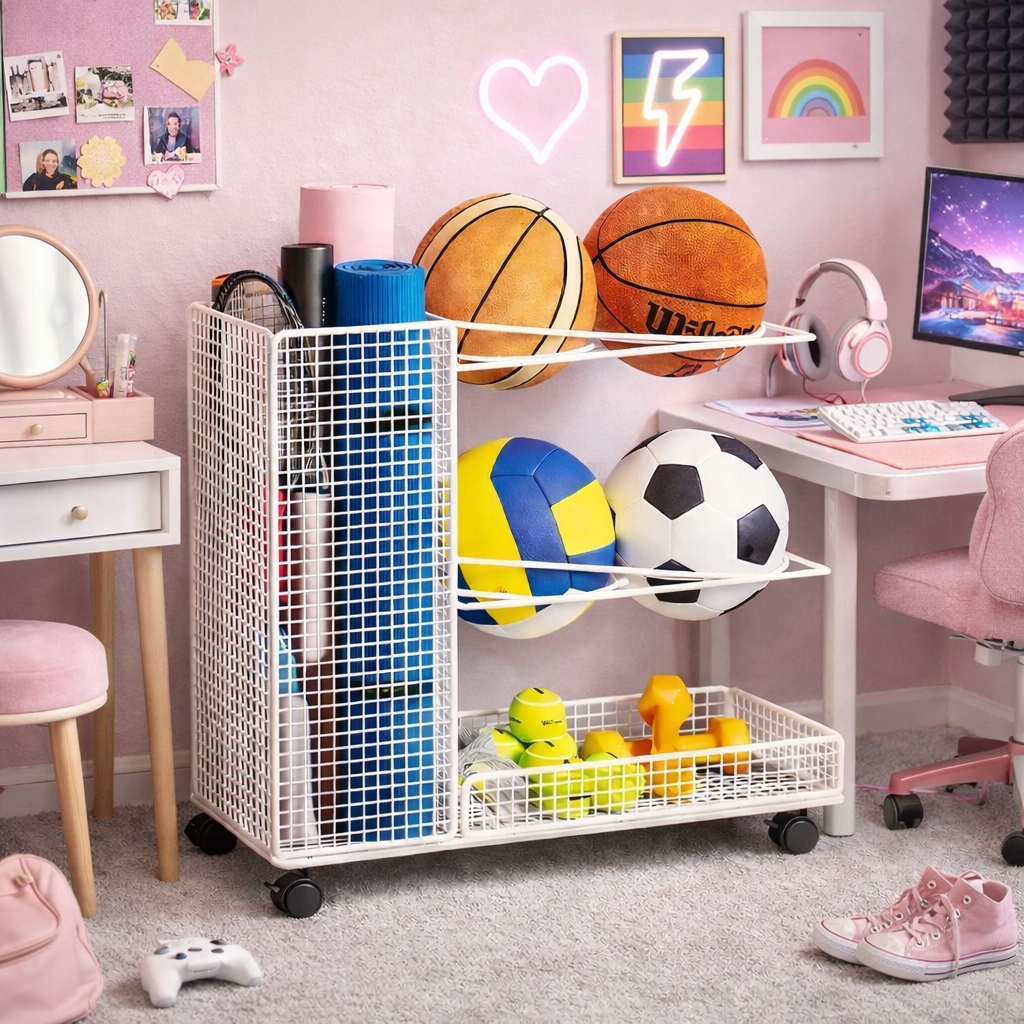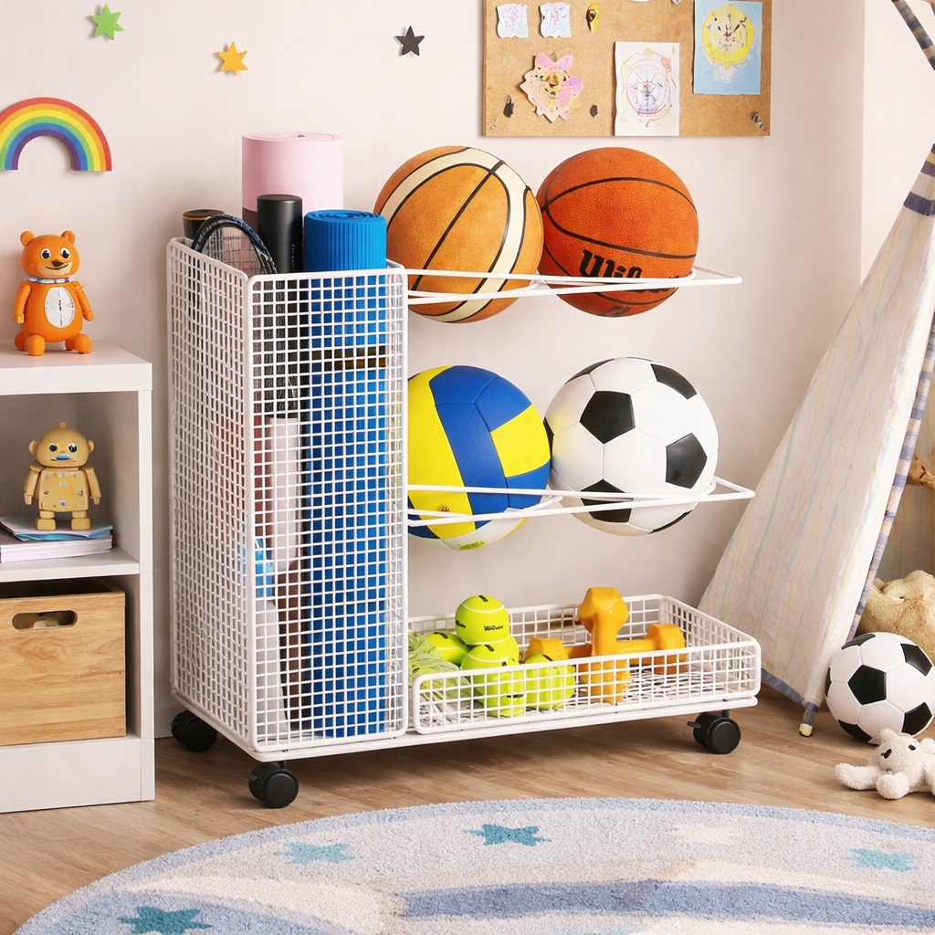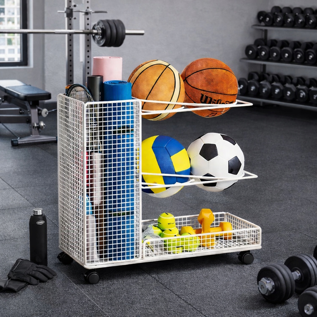 ? Stojak na 4 piłki + organizer sportowy na kółkach – porządek i wygoda w jednym.