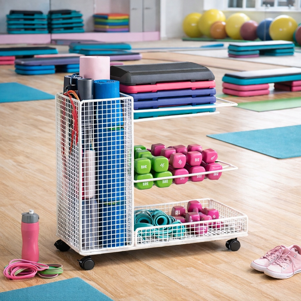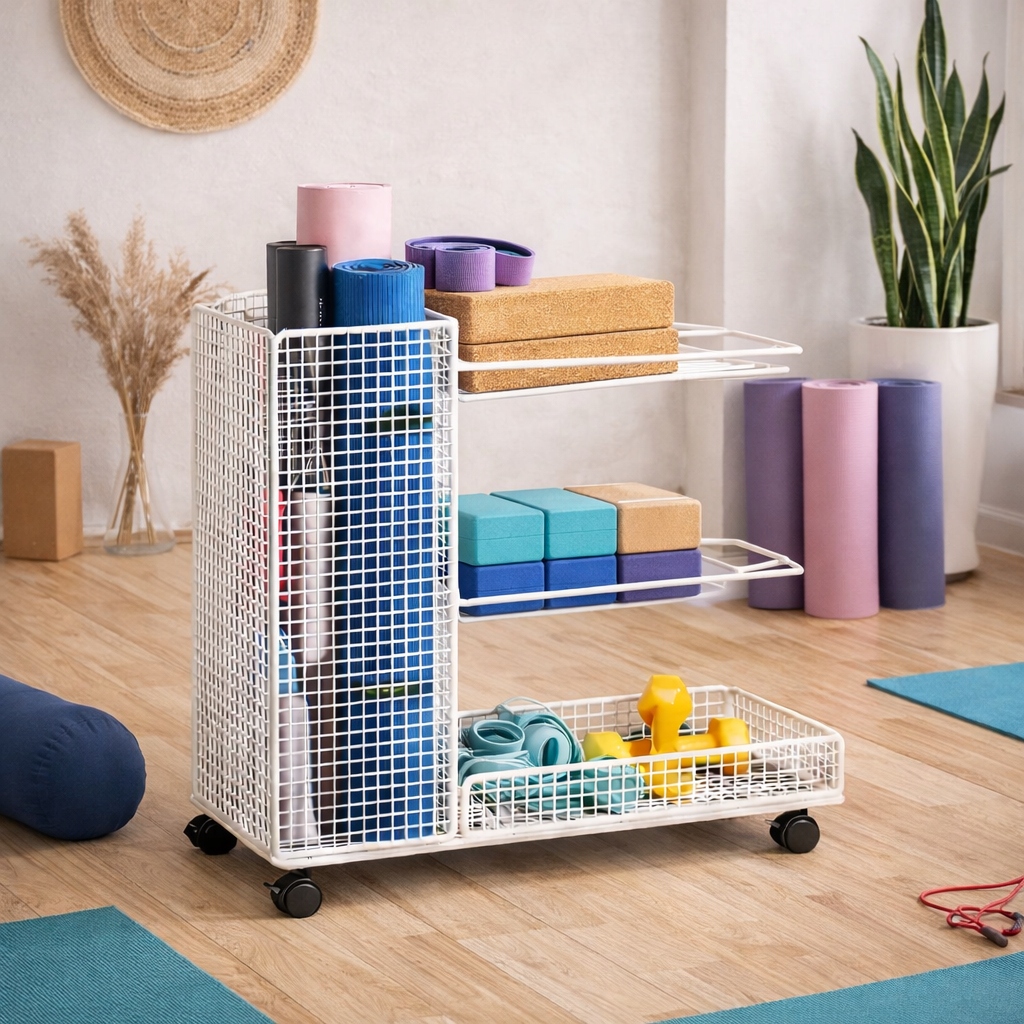 - Boczny kosz pionowy – na maty, rakiety lub wałki fitness