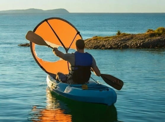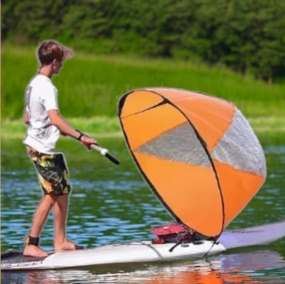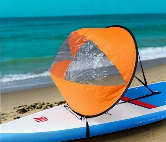 Duży żagiel do supa, kajaka czy pontonu o średnicy 108cm. Żagiel jest lekki, składany i łatwy w obsłudze z paskami sterującymi dla zwiększenia prędkości.