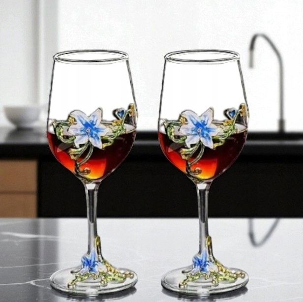 Eleganckie i stylowe kieliszki do czerwonego wina z przepięknymi detalami w kolorze złota, zieleni i niebieskiego, co nadaje im niepowtarzalny charakter.