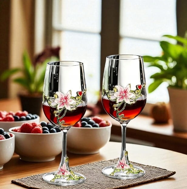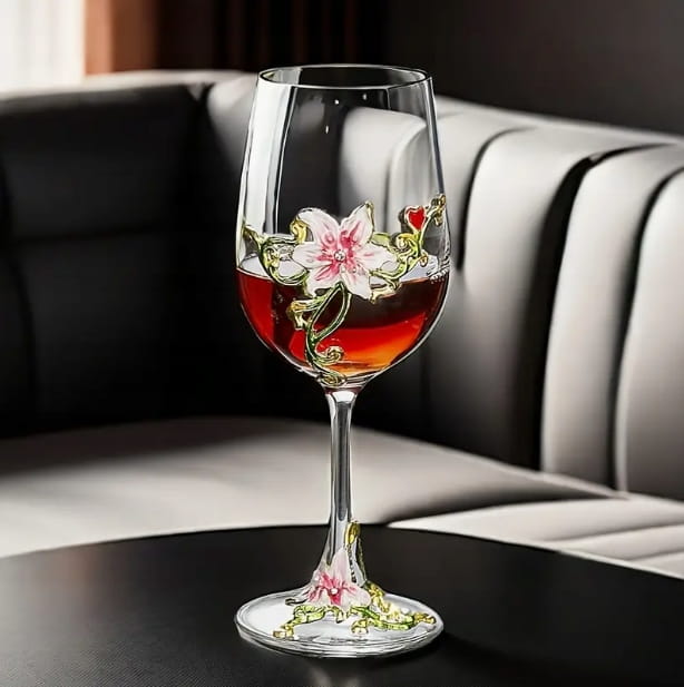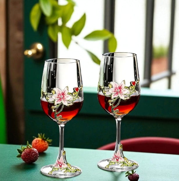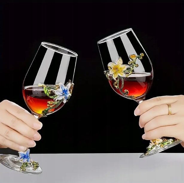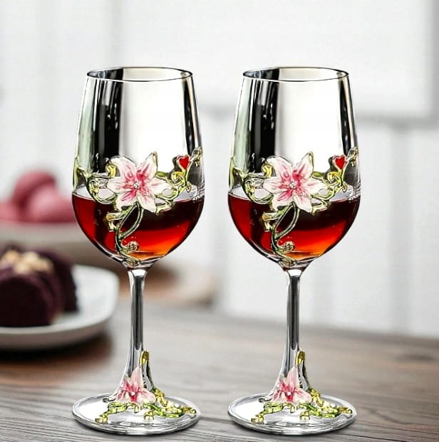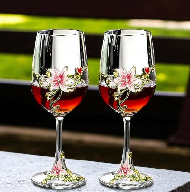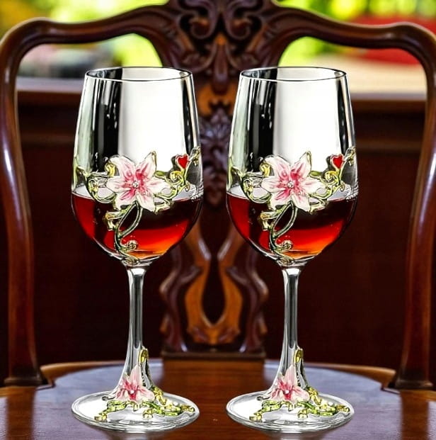 Eleganckie i stylowe kieliszki do czerwonego wina z przepięknymi detalami w kolorze złota, zieleni i różowego, co nadaje im niepowtarzalny charakter.