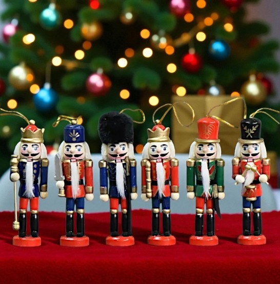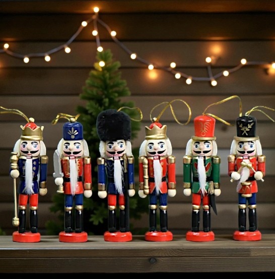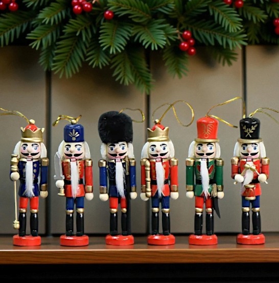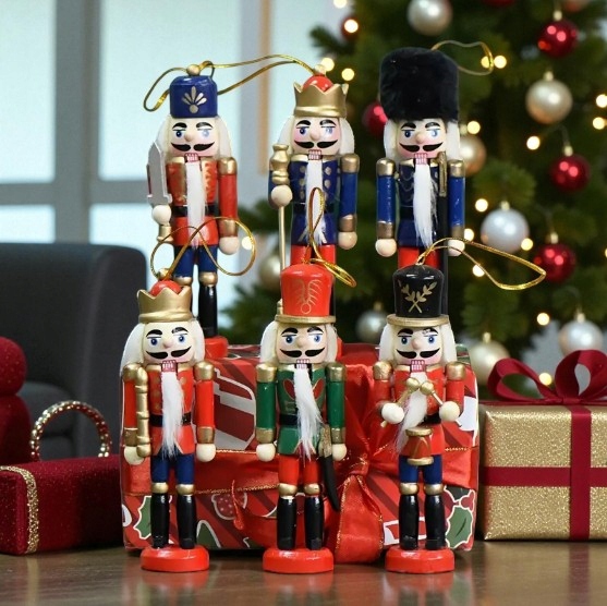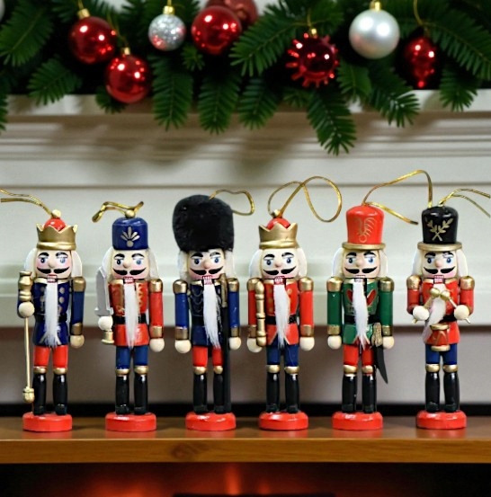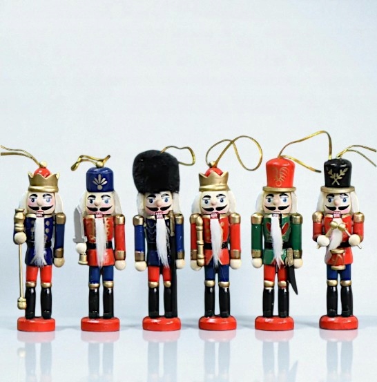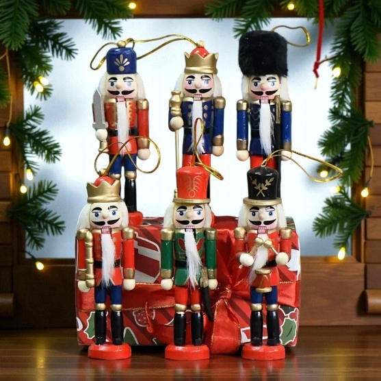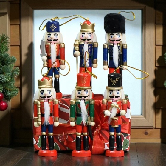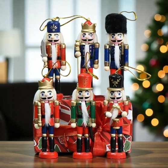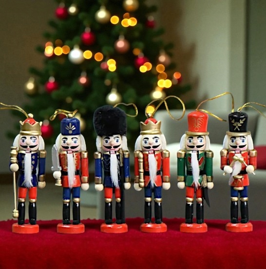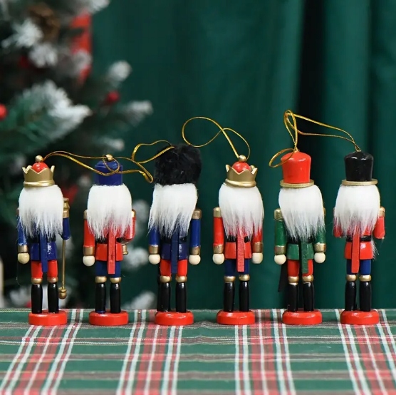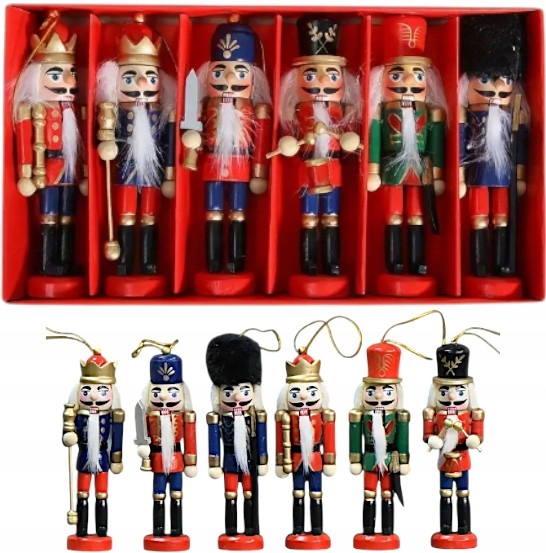 Dodaj swojej choince wyjątkowego charakteru dzięki uroczemu zestawowi 6 drewnianych żołnierzyków Dziadka do Orzechów. Każda figurka została starannie wykonana, ręcznie malowana i wyposażona w zawieszkę, dzięki czemu możesz od razu udekorować drzewko. To idealny sposób, aby wprowadzić do domu świąteczną tradycję, kolor i klasyczny urok.