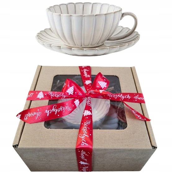 Zestaw Prezentowy – Filiżanka 250 ml + spodek + ozdobne pudełko + wypełniacz + wstążka „Wesołych Świąt”
